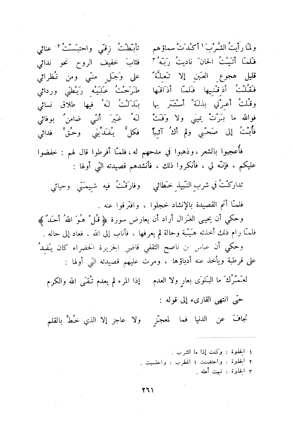 تداركت في شرب النّبيذ خطائي ... وفارقت فيه شيمتي وحيائي فلمّا أتم القصيدة بالإنشاد خجلوا، وافترقوا عنه.