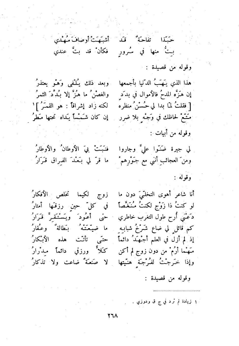 وإذا خرجت لفرجةٍ هنّيتها ... لا صنعةٌ ضاعت ولا تذكار وقوله من قصيدة: