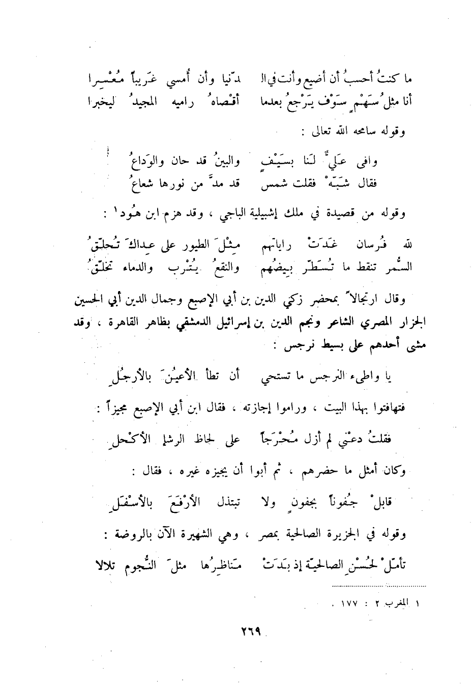 السّمر تنقط ما تسطّر بيضهم ... والنقع يترب والدماء تخلّق وقال ارتجالاً بمحضر زكي الدين بن أبي الإصبع وجمال الدين أبي الحسين الجزار المصري الشاعر ونجم الدين بن إسرائيل الدمشقي بظاهر القاهرة، وقد مشى أحدهم على بسيط نرجس: