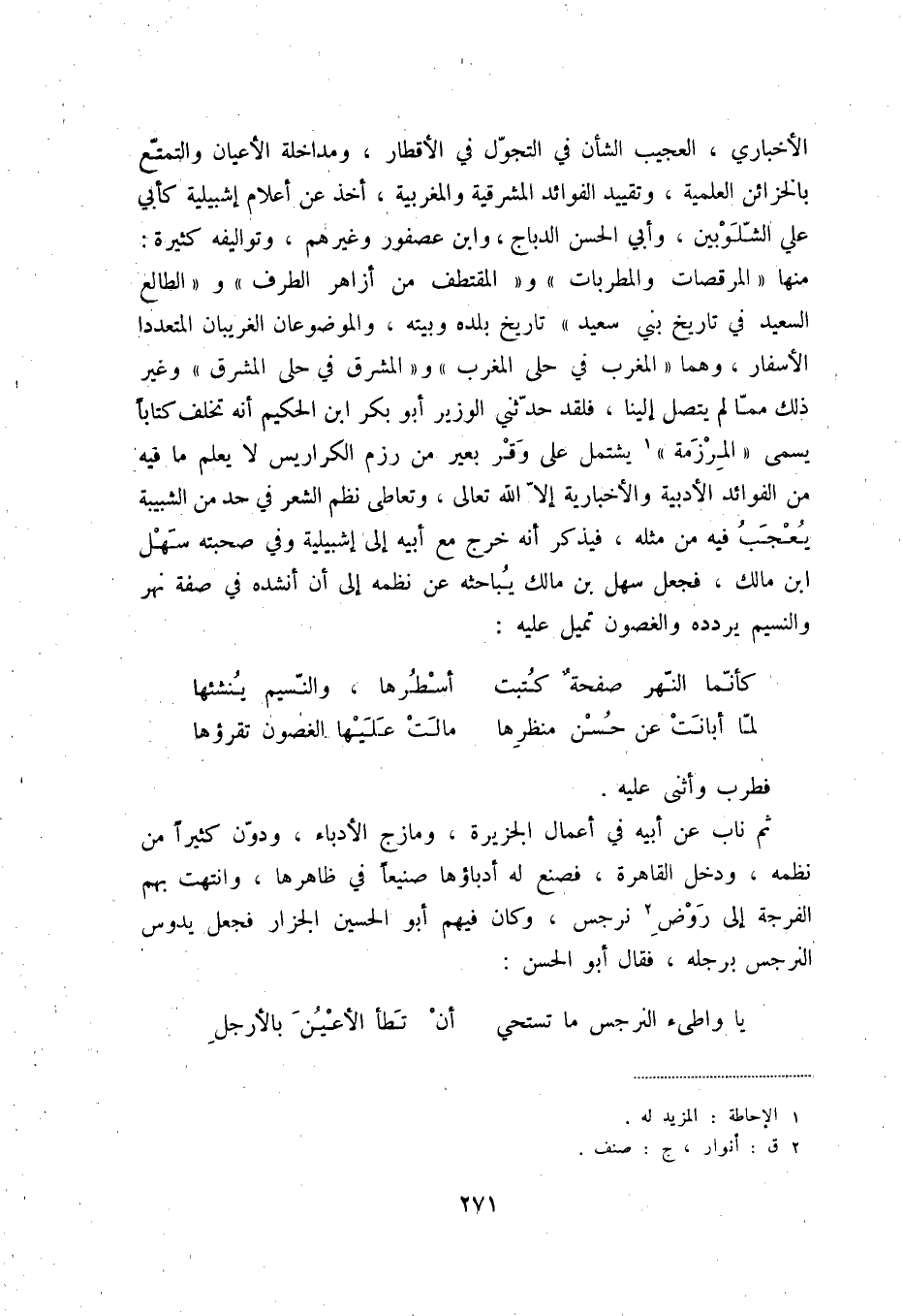 الأخباري، العجيب الشأن في التجوّل في الأقطار، ومداخلة الأعيان والتمتّع بالخزائن العلمية، وتقييد الفوائد المشرقية والمغربية، أخذ عن أعلام إشبيلية كأبي علي الشّلوبين، وأبي الحسن الدباج، وابن عصفور وغيرهم، وتواليفه كثيرة: منها " المرقصات والمطربات " و " المقتطف من أزاهر الطرف " و " الطالع السعيد في تاريخ بني سعيد " تاريخ بلده وبيته، والموضوعان الغريبان المتعددا الأسفار، وهما " المغرب في حلى المغرب " و " المشرق في حلى المشرق " وغير ذلك ممّا لم يتصل إلينا، فلقد حدّثني الوزير أبو بكر ابن الحكيم أنه تخلف كتاباً يسمى " المرزمة " (1) يشتمل على وقر بعير من رزم الكراريس لا يعلم ما فيه من الفوائد الأدبية والأخبارية إلاّ الله تعالى، وتعاطى نظم الشعر في حد من الشبيبة يعجب فيه من مثله، فيذكر أنه خرج مع أبيه إلى إشبيلية وفي صحبته سهل ابن مالك، فجعل سهل بن مالك يباحثه عن نظمه إلى أن أنشده في صفة نهر والنسيم يردده والغصون تميل عليه: