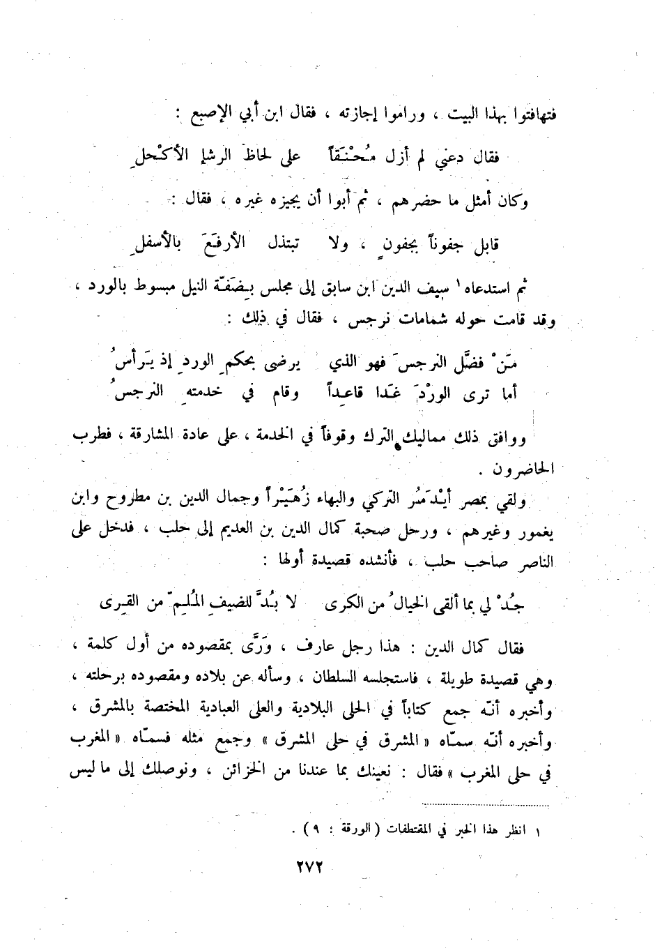 جد لي بما ألقى الخيال من الكرى ... لا بدّ للضيف الملمّ من القرى فقال كمال الدين: هذا رجل عارف، ورّى بمقصودة من أول كلمة، وهي قصيدة طويلة، فاستجلسه السلطان، وسأله عن بلاده ومقصوده برحلته، وأخبره أنّه جمع كتاباً في الحلى البلادية والعلى العبادية المختصة بالمشرق، وأخبره أنّه سمّاه " المشرق في حلى المشرق " وجمع مثله فسمّاه " المغرب في حلى المغرب " فقال: نعينك بما عندنا من الخزائن، ونوصلك إلى ما ليس