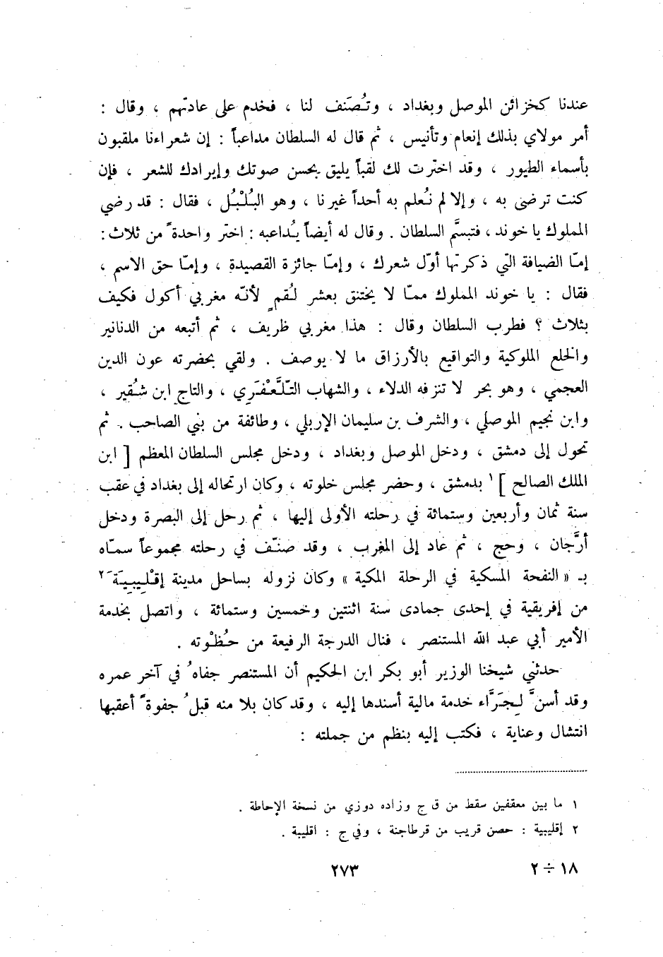 عندنا كخزائن الموصل وبغداد، وتصنف لنا، فخدم على عادتهم، وقال: أمر مولاي بذلك إنعام وتأنيس، ثم قال له السلطان مداعباً: إن شعراءنا ملقبون بأسماء الطيور، وقد اخترت لك لقباً يليق بحسن صوتك وإيرادك للشعر، فإن كنت ترضى به، وإلا لم نعلم به أحداً غيرنا، وهو البلبل، فقال: قد رضي المملوك يا خوند. فتبسّم السلطان، وقال له أيضاً يداعبه: اختر واحدةً من ثلاث: إمّا الضيافة التي ذكرتها أوّل شعرك، وإمّا جائزة القصيدة، وإمّا حق الاسم، فقال: يا خوند المملوك ممّا لا يختنق بعشر لقمٍ لأنّه مغربي أكول فكيف بثلاث فطرب السلطان وقال: هذا مغربي ظريف، ثم أتبعه من الدنانير والخلع الملوكية والتواقيع بالأرزاق ما لا يوصف. ولقي بحضرته عون الدين العجمي، وهو بحر لا تنزفه الدلاء، والشهاب التّلّعفري، والتاج ابن شقير، وابن نجيم الموصلي، والشرف بن سليمان الإربلي، وطائفة من بني الصاحب. ثم تحول إلى دمشق، ودخل الموصل وبغداد، ودخل مجلس السلطان المعظم [ابن الملك الصالح] (1) بدمشق، وحضر مجلس خلوته، وكان ارتحاله إلى بغداد في عقب سنة ثمان وأربعين وستمائة في رحلته الأولى إليها، ثم رحل إلى البصرة ودخل أرّجان، وحج، ثم عاد إلى المغرب، وقد صنّف في رحلته مجموعاً سمّاه ب " النفحة المسكية في الرحلة المكية " وكان نزوله بساحل مدينة إقليبية (2) من إفريقية في إحدى جمادى سنة اثنتين وخمسين وستمائة، واتصل بخدمة الأمير أبي عبد الله المستنصر، فنال الدرجة الرفيعة من حظوته.