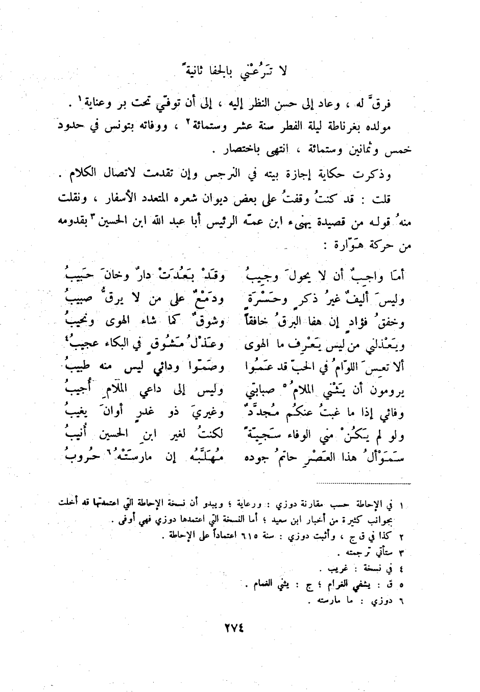 (1) في الإحاطة حسب مقارنة دوزي: ورعاية؛ ويبدو أن نسخة الإحاطة التي اعتمدتها قد أخلت بجوانب كثيرة من أخبار ابن سعيد؛ أما النسخة التي اعتمدها دوزي فهي أوفى.