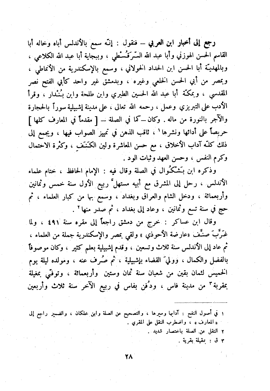 (1) في أصول النفح: آدابها وسيرها، والتصحيح عن الصلة وابن خلكان، والضمير راجع إلى " المعارف "، واضطرب النقل على المقري.