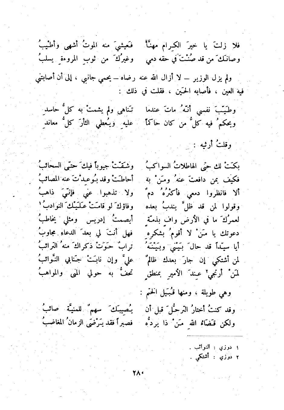 وصانك من قد صنت في حقه دمي ... وغيرك ن ثوب المروءة يسلب ولم يزل الوزير - لا أزال الله عنه رضاه - يحمي جانبي، إلى أن أصابتني فيه العين، فأصابه الحين، فقلت في ذلك: