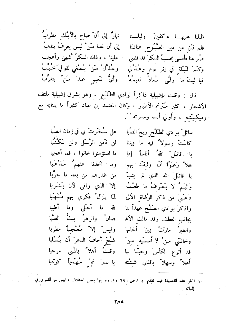 فيا ليت ما ولّى معادٌ نعيمه ... وأيّ نعيمٍ عند من يتغرّب قال: وقلت بإشبيلية ذاكراً لوادي الطّلح، وهو بشرق إشبيلية ملتف الأشجار، كثير مترنم الأطيار، وكان المعتمد بن عباد كثيراً ما ينتابه مع رميكيّته، وأولي أنسه ومسرته (1) :