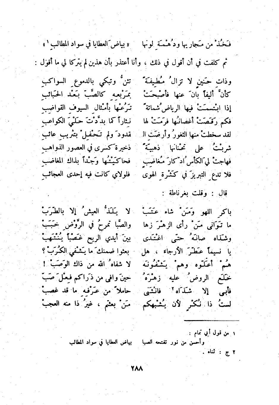 وأحسن من نور تفتحه الصبا ... بياض العطايا في سواد المطالب (2) ج: ثناه.