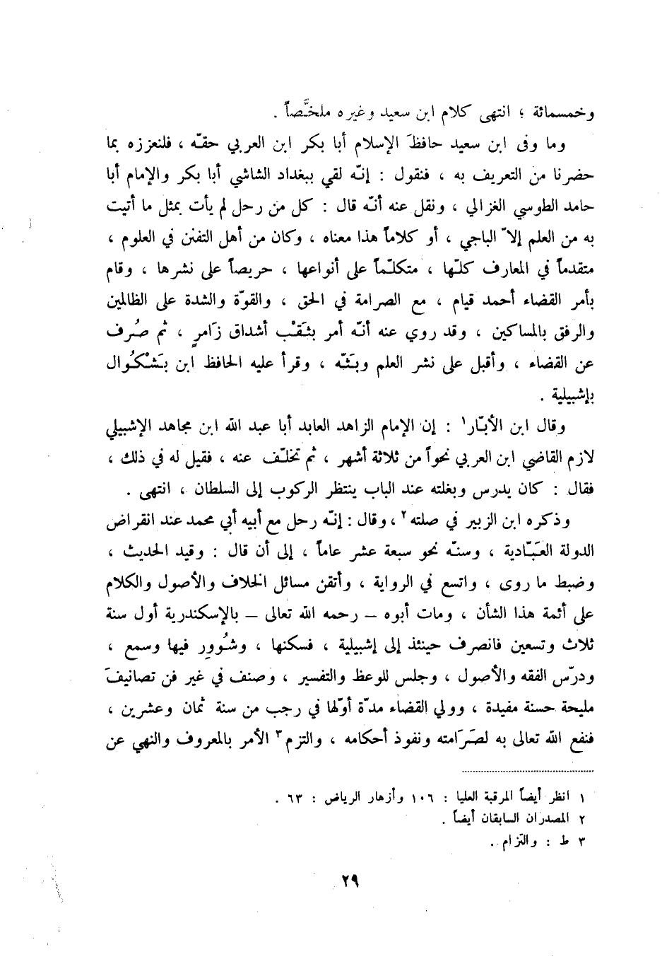 وما وفى ابن سعيد حافظ الإسلام أبا بكر ابن العربي حقّه، فلنعززه بما حضرنا من التعريف به، فنقول: إنّه لقي ببغداد الشاشي أبا بكر والإمام أبا حامد الطوسي الغزالي، ونقل عنه أنّه قال: كل من رحل لم يأت بمثل ما أتيت به من العلم إلاّ الباجي، أو كلاماً هذا معناه، وكان من أهل التفنن في العلوم، متقدماً في المعارف كلّها، متكلّماً على أنواعها، حريصاً على نشرها، وقام بأمر القضاء أحمد قيام، مع الصرامة في الحق، والقوّة والشدة على الظالمين والرفق بالمساكين، وقد روي عنه أنّه أمر بثقب أشداق زامرْ، ثم صرف عن القضاء، وأقبل على نشر العلم وبثّه، وقرأ عليه الحافظ ابن بشكوال بإشبيلية.