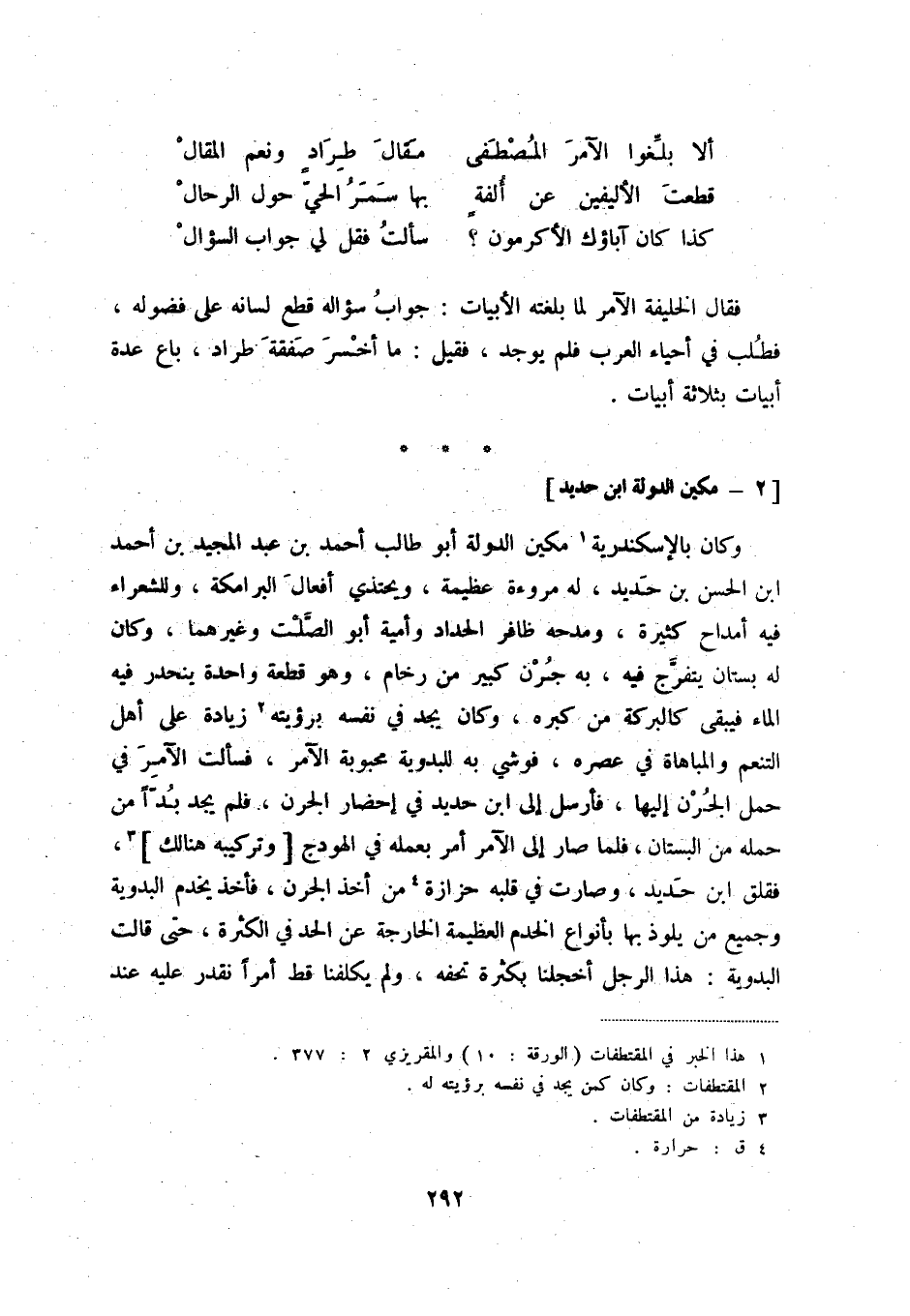 كذا كان آباؤك الأكرمون ... سألت فقل لي جواب السؤال فقال الخليفة الآمر لما بلغته الأبيات: جواب سؤاله قطع لسانه على فضوله، فطلب في أحياء العرب فلم يوجد، فقيل: ما أخسر صفقة طراد، باع عدة أبيات بثلاثة أبيات.