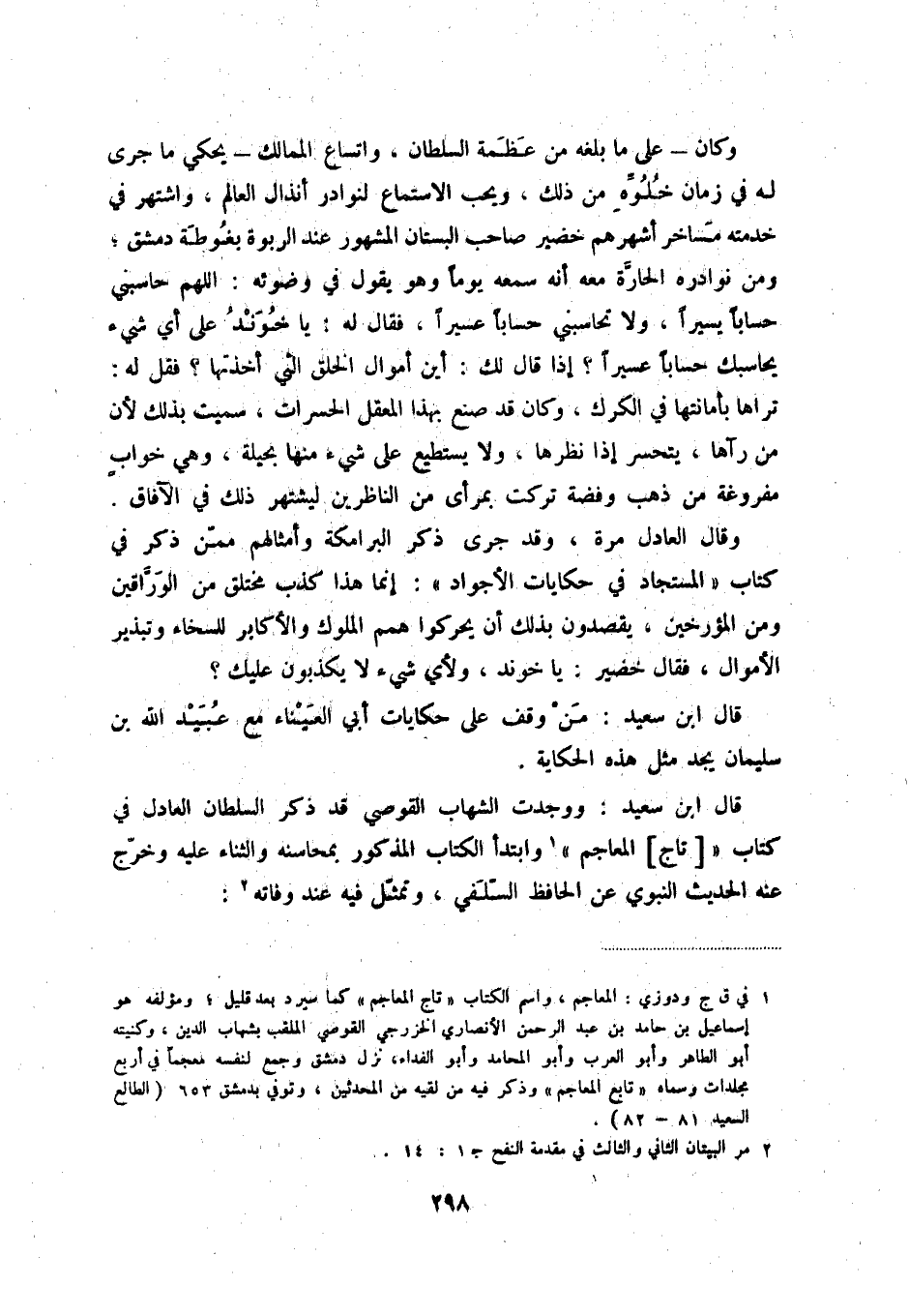 وقال العادل مرة، وقد جرى ذكر البرامكة وأمثالهم ممّن ذكر في كتاب المستجاد في حكايات الأجواد: إنما هذا كذب مختلق من الورّاقين ومن المؤرخين، يقصدون بذلك أن يحركوا همم الملوك والأكابر للسخاء وتبذير الأموال، فقال خضير: يا خوند، ولأي شيء لا يكذبون عليك