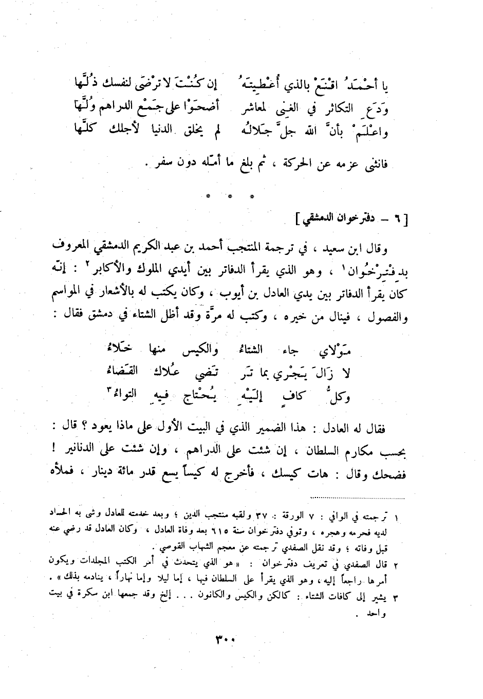 وقال ابن سعيد، في ترجمة المنتجب أحمد بن عبد الكريم الدمشق المعروف بدفتر خوان (1) ، وهو الذي يقرأ الدفاتر بين أيدي الملوك والأكابر (2) : إنّه كان يقرأ الدفاتر بين يدي العادل بن أيوب، وكان يكتب له بالأشعار في المواسم والفصول، فينال من خيره، وكتب له مرّة وقد أظل الشتاء في دمشق فقال: