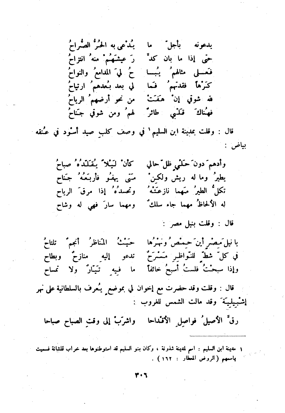 فهناك قلبي طائرٌ ... لهم ومن شوقي جناح قال: وقلت بمدينة ابن السليم (1) في وصف كلب صيد أسود في عنقه بياض: