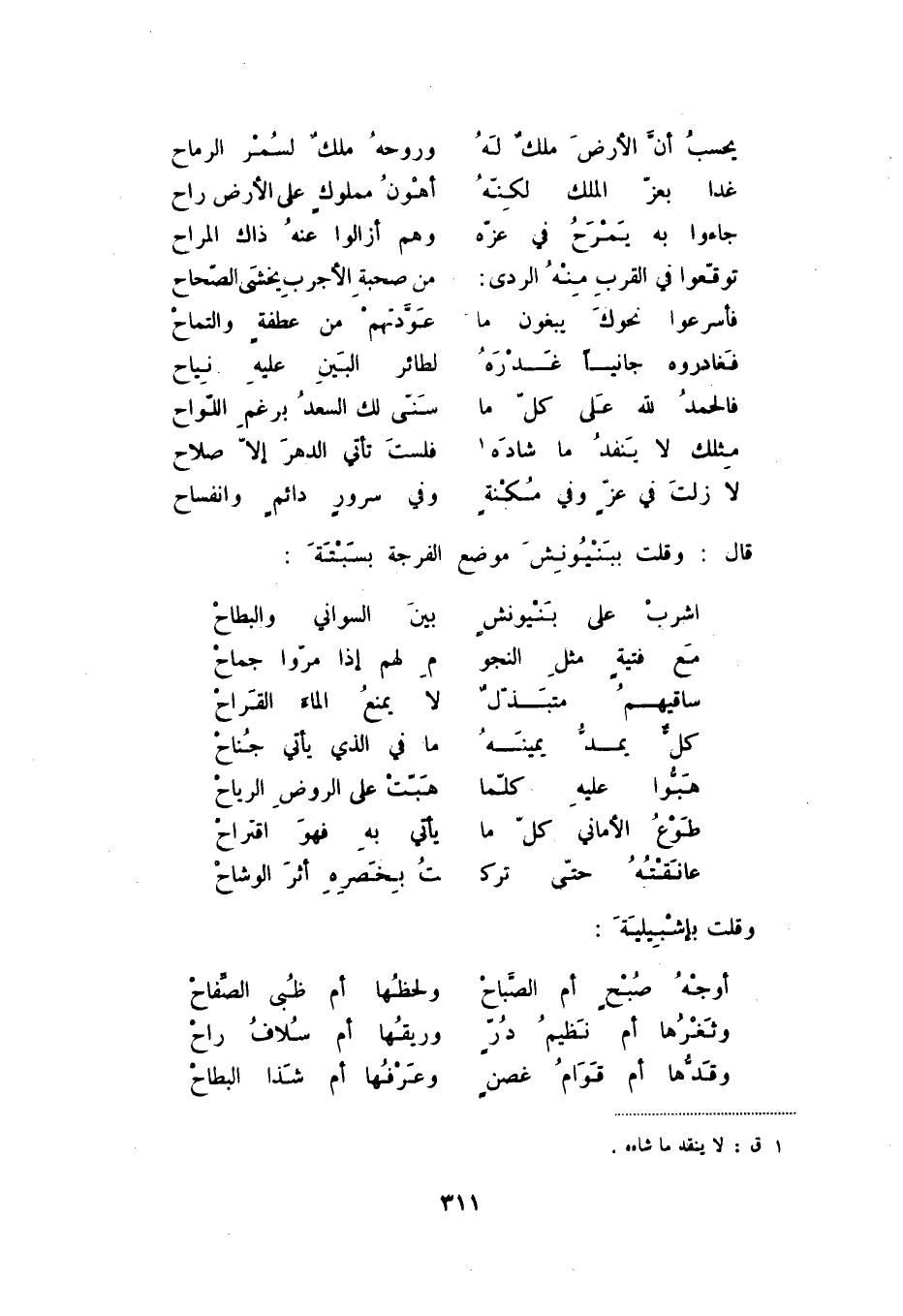 لا زلت في عزٍّ وفي مكنةٍ ... وفي سرورٍ دائمٍ وانفساح قال: وقلت ببنيونش موضع الفرجة بسبتة: