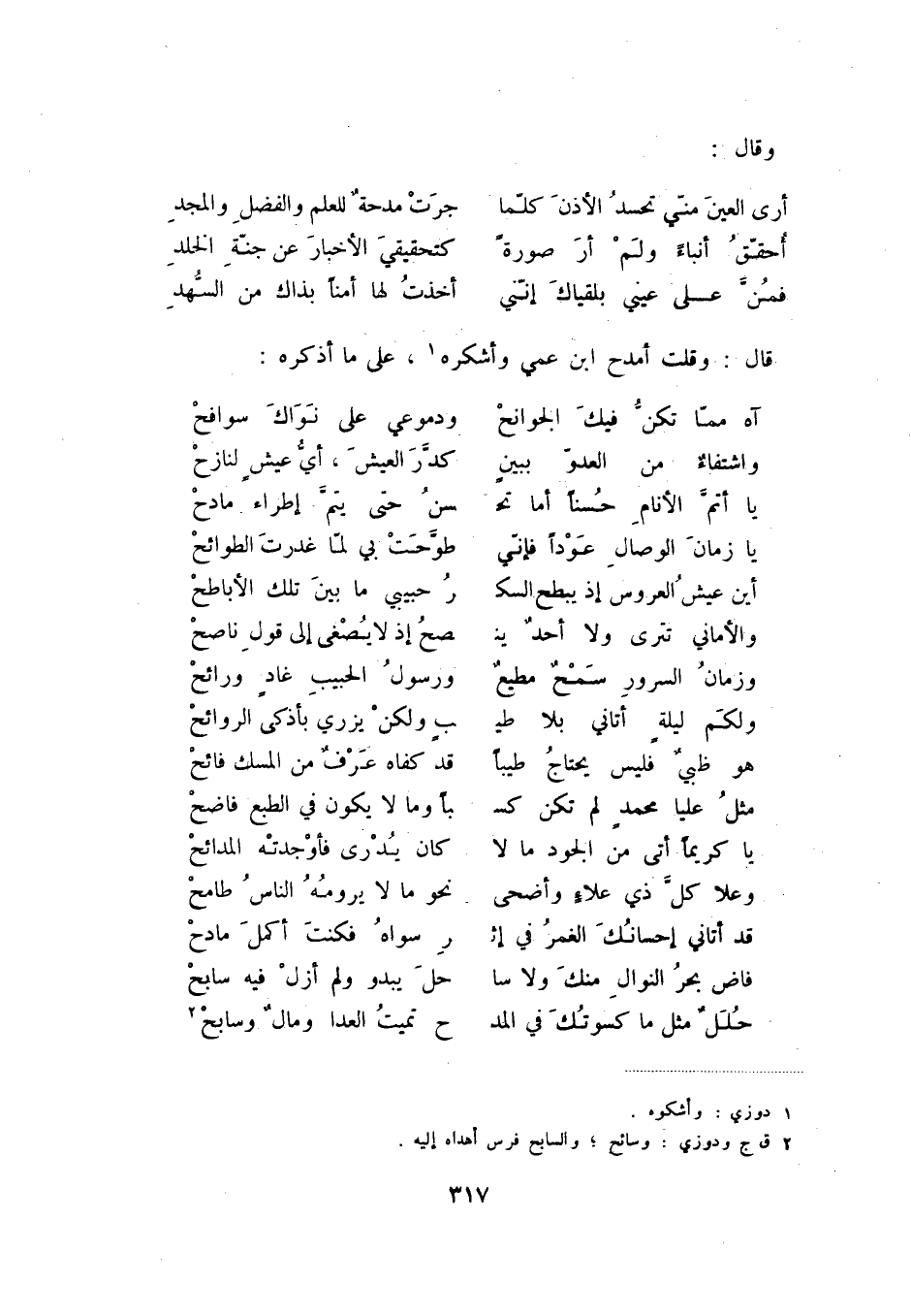 فمنّ على عيني بلقياك إنّني ... أخذت لها أمناً بذاك من السّهد قال: وقلت أمدح ابن عمي وأشكره (1) ، على ما أذكره: