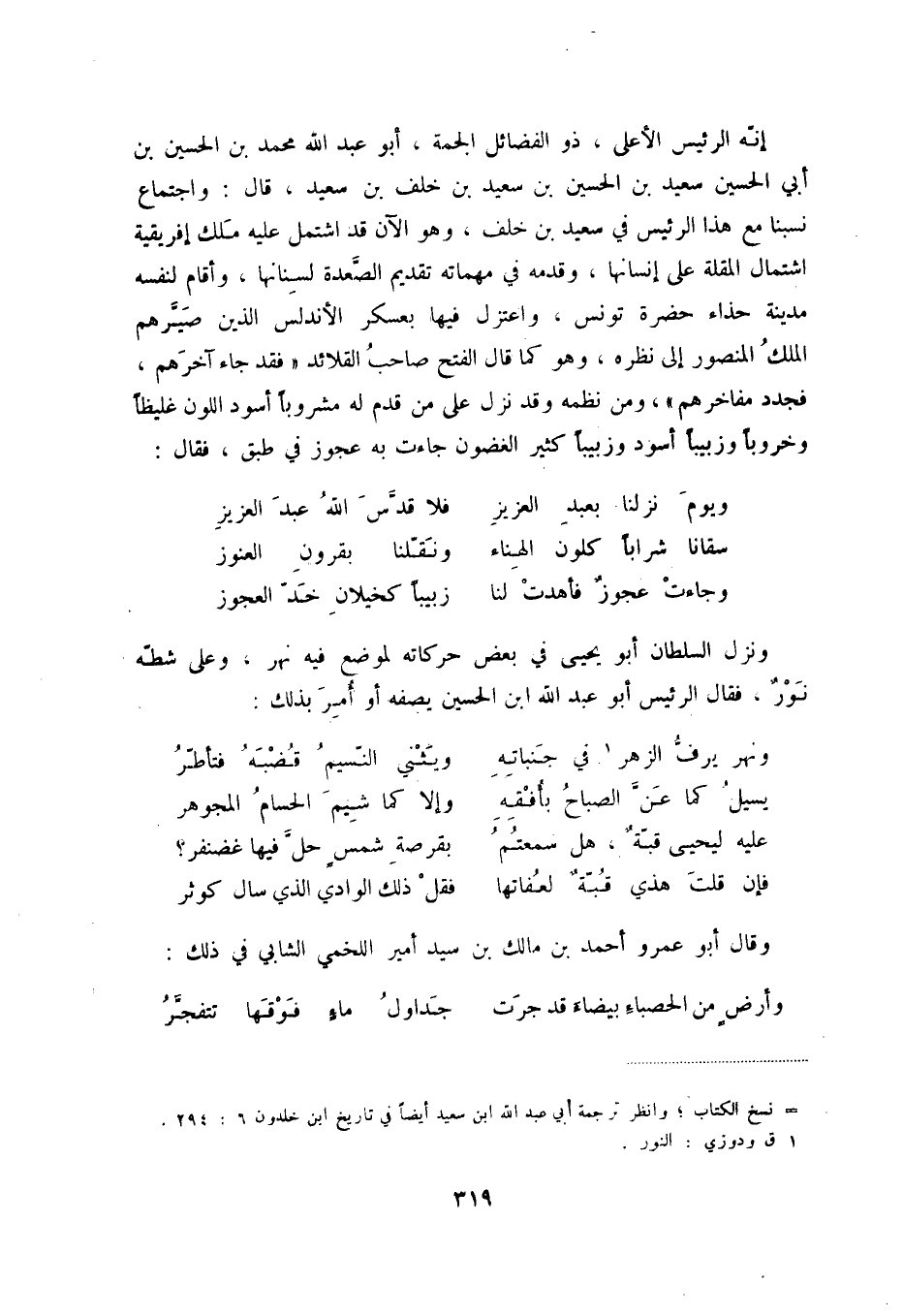 وجاءت عجوزٌ فأهدت لنا ... زبيباً كخيلان خدّ العجوز ونزل السلطان أبو يحيى في بعض حركاته لموضع فيه نهر، وعلى شطّه نورٌ، فقال الرئيس أبو عبد الله ابن الحسين يصفه أو أمر بذلك: