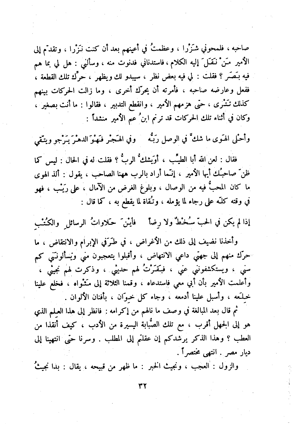 إذا لم يكن في الحبّ سخطٌ ولا رضاً ... فأين حلاوات الرسائل والكتب وأخذنا نضيف إلى ذلك من الأغراض، في طرفي الإبرام والانتقاض، ما حرّك منهم إلى جهتي داعي الانتهاض، وأقبلا يتعجبون مني ويسألونني كم سني، ويستكشفونني عني، فبقرت لهم حديثي، وذكرت لهم نجيثي، وأعلمت الأمير بأن أبي معي فاستدعاه، وقمنا الثلاثة إلى مثواه، فخلع علينا خلعه، وأسبل علينا أدمعه، وجاء كل خوان، بأفنان الألوان.