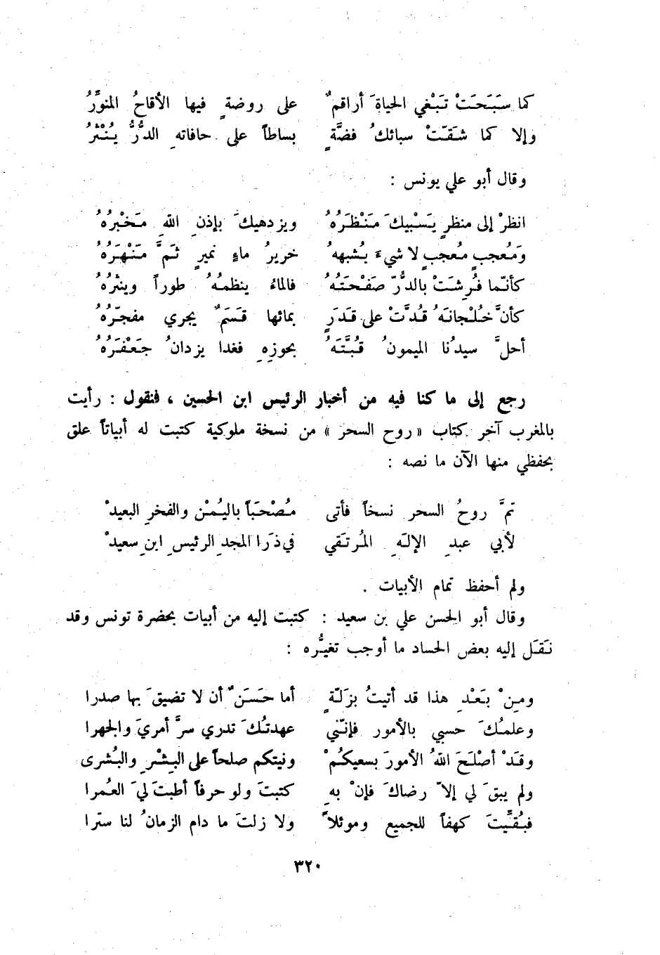 أحلّ سيدنا الميمون قبّته ... بحوزه فغدا يزدان جعفره رجع إلى ما كنا فيه من أخبار الرئيس ابن الحسين، فنقول: رأيت بالمغرب آخر كتاب " روح السحر " من نسخة ملوكية كتبت له أبياتاً علق بحفظي منها الآن ما نصه: