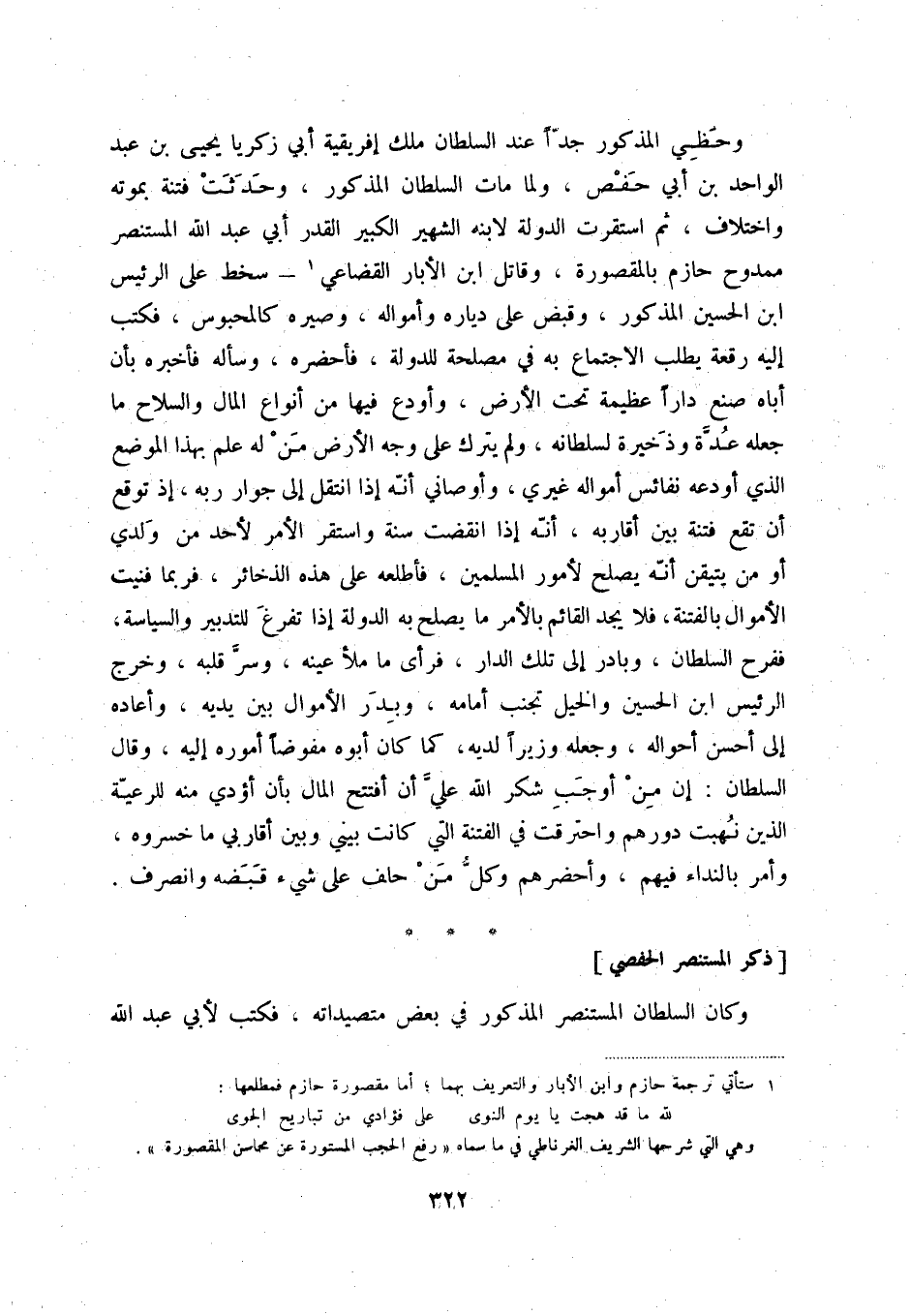 وحظي المذكور جدّاً عند السلطان ملك إفريقية أبي زكريا يحيى بن عبد الواحد بن أبي حفص، ولما مات السلطان المذكور، وحدثت فتنة بموته واختلاف، ثم استقرت الدولة لابنه الشهير الكبير القدر أبي عبد الله المستنصر ممدوح حازم بالمقصورة، وقاتل ابن الأبار القضاعي (1) - سخط على الرئيس ابن الحسين المذكور، وقبض على دياره وأمواله، وصيره كالمحبوس، فكتب إليه رقعة يطلب الاجتماع به في مصلحة للدولة، فأحضره، وسأله فأخبره بأن أباه صنع داراً عظيمة تحت الأرض، وأودع فيها من أنواع المال والسلاح ما جعله عدّة وذخيرة لسلطانه، ولم يترك على وجه الأرض من له علم بهذا الموضع الذي أودعه نفائس أمواله غيري، وأوصاني أنّه إذا انتقل إلى جوار ربه، إذ توقع أن تقع فتنة بين أقاربه، أنّه إذا انقضت سنة واستقر الأمر لأحد من ولدي أو من يتيقن أنّه يصلح لأمور المسلمين، فأطلعه على هذه الذخائر، فربما فنيت الأموال بالفتنة، فلا يجد القائم بالأمر ما يصلح به الدولة إذا تفرغ للتدبير والسياسة، ففرح السلطان، وبادر إلى تلك الدار، فرأى ما ملأ عينه، وسرّ قبله، وخرج الرئيس ابن الحسين والخيل تجنب أمامه، وبدر الأموال بين يديه، وأعاده إلى أحسن أحواله، وجعله وزيراً لديه، كما كان أبوه مفوضاً أموره إليه، وقال السلطان: إن من أوجب شكر الله عليّ أن أفتتح المال بأن أؤدي منه للرعيّة الذين نهبت دورهم واحترقت في الفتنة التي كانت بيني وبين أقاربي ما خسروه، وأمر بالنداء فيهم، وأحضرهم وكلّ من حلف على شيء قبضه وانصرف.