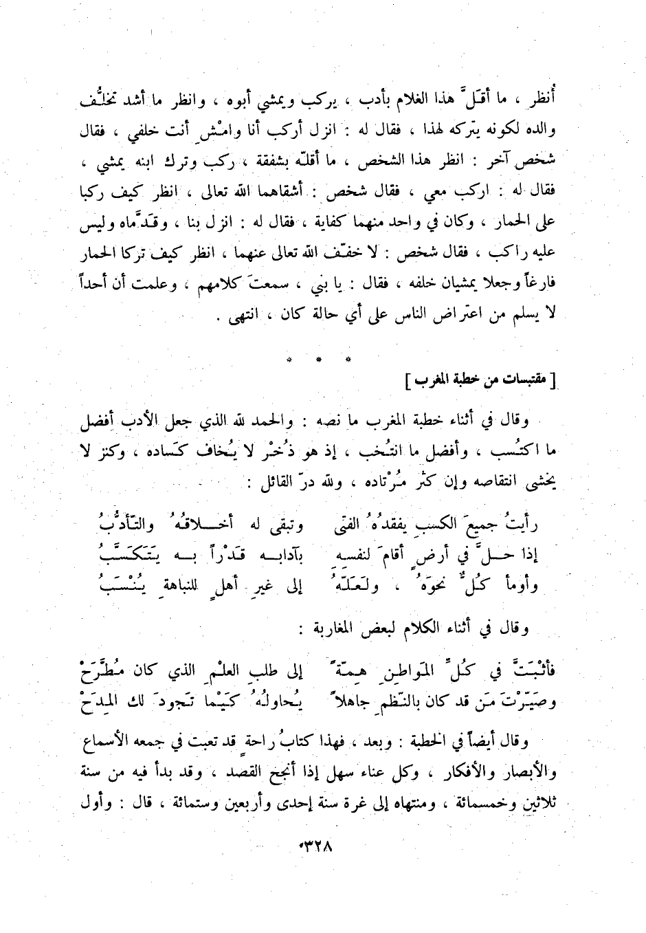 وقال في أثناء خطبة المغرب ما نصه: والحمد لله الذي جعل الأدب أفضل ما اكتسب، وأفضل ما انتخب، إذ هو ذخر لا يخاف كساده، وكنز لا يخشى انتقاصه وإن كثر مرتاده، ولله درّ القائل: