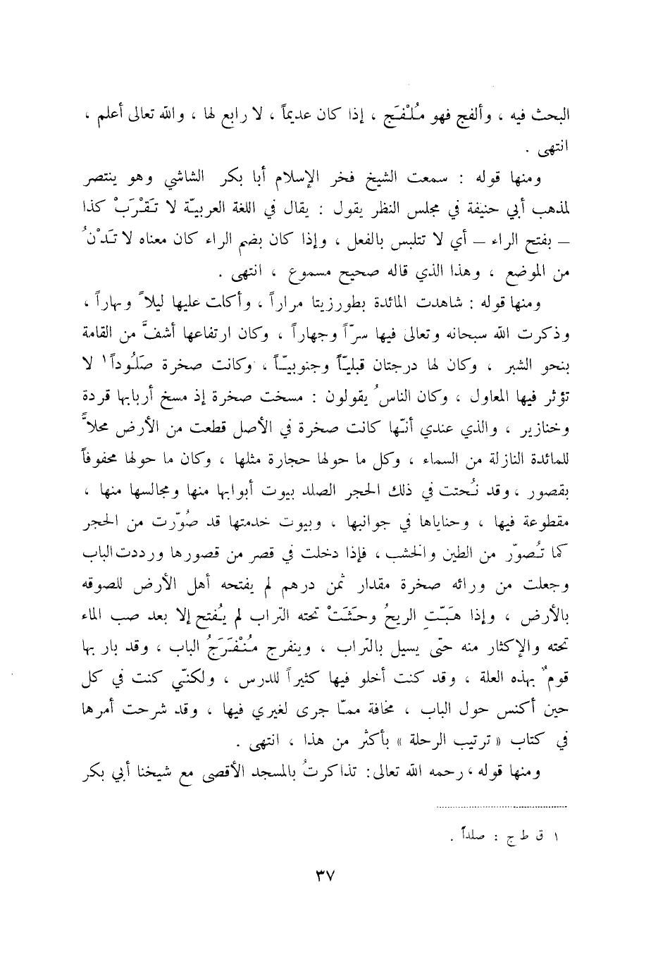 ومنها قوله، رحمه الله تعالى: تذاكرت بالمسجد الأقصى مع شيخنا أبي بكر