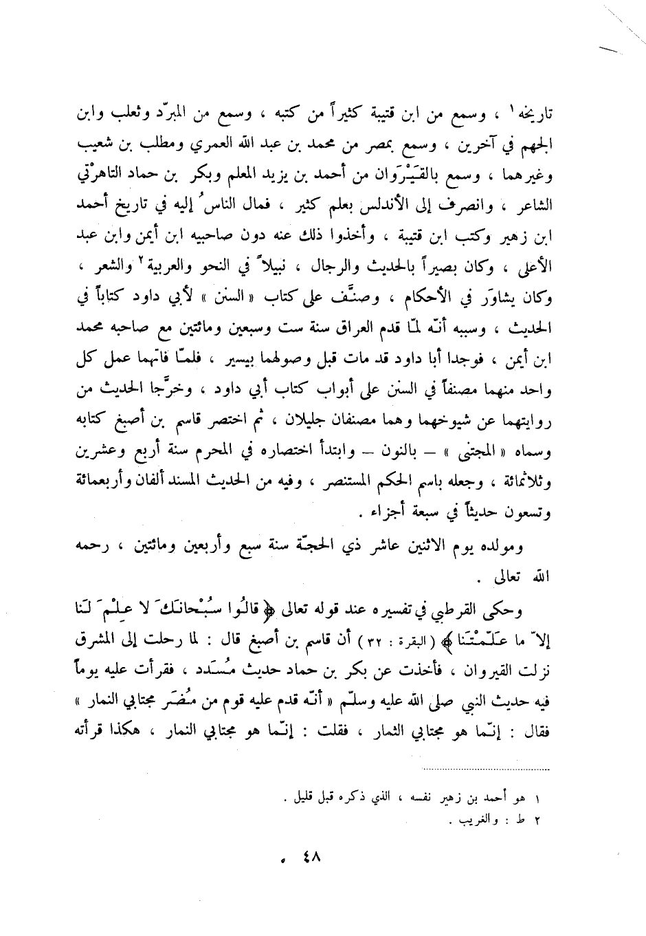 تاريخه (1) ، وسمع من ابن قتيبة كثيراً من كتبه، وسمع من المبرّد وثعلب وابن الجهم في آخرين، وسمع بمصر من محمد بن عبد الله العمري ومطلب بن شعيب وغيرهما، وسمع بالقيروان من أحمد بن يزيد المعلم وبكر بن حماد التاهرتي الشاعر، وانصرف إلى الأندلس بعلم كثير، فمال الناس إليه في تاريخ أحمد ابن زهير وكتب ابن قتيبة، وأخذوا ذلك عنه دون صاحبيه ابن أيمن وابن عبد الأعلى، وكان بصيراً بالحديث والرجال، نبيلاً في النحو والعربية (2) والشعر، وكان يشاور في الأحكام، وصنّف على كتاب السنن لأبي داود كتاباً في الحديث، وسببه أنّه لمّا قدم العراق سنة ست وسبعين ومائتين مع صاحبه محمد ابن أيمن، فوجدا أبا داود قد مات قبل وصولهما بيسير، فلمّا فاتهما عمل كل واحد منهما مصنفاً في السنن على أبواب كتاب أبي داود، وخرّجا الحديث من روايتهما عن شيوخهما وهما مصنفان جليلان، ثم اختصر قاسم بن أصبغ كتابه وسماه المجتنى - بالنون - وابتدأ اختصاره في المحرم سنة أربع وعشرين وثلاثمائة، وجعله باسم الحكم المستنصر، وفيه من الحديث المسند ألفان وأربعمائة وتسعون حديثاً في سبعة أجزاء.