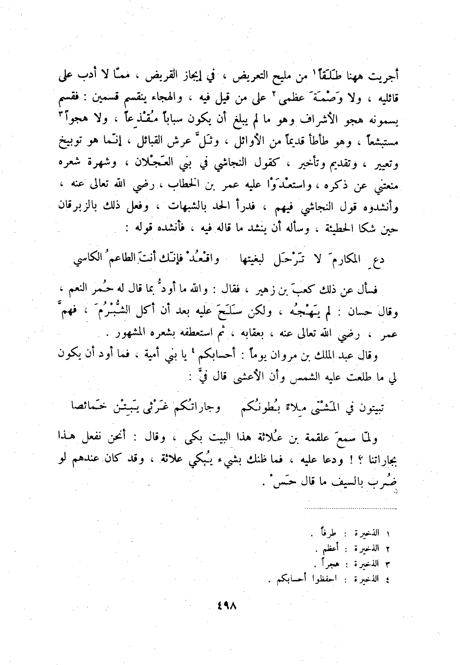 أجريت ههنا طلقاً (1) من مليح التعريض، في إيجاز القريض، ممّا لا أدب على قائليه، ولا وصمة عظمى (2) على من قيل فيه، والهجاء ينقسم قسمين: فقسم يسمونه هجو الأشراف وهو ما لم يبلغ أن يكون سباباً مقذعاً، ولا هجواً (3) مستبشعاً، وهو طأطأ قديماً من الأوائل، وثلّ عرش القبائل، إنّما هو توبيخ وتعبير، وتقديم وتأخير، كقول النجاشي في بني العجلان، وشهرة شعره منعتي عن ذكره، واستعدوا عليه عمر بن الخطاب، رضي الله تعالى عنه، وأنشدوه قول النجاشي فيهم، فدرأ الحد بالشبهات، وفعل ذلك بالزبرقان حين شكا الحطيئة، وسأله أن ينشد ما قاله فيه، فأنشده قوله: