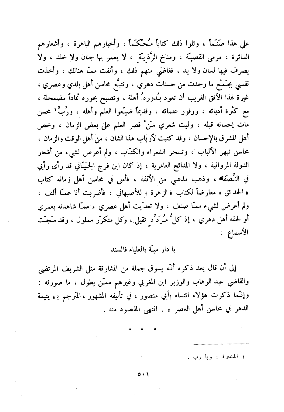 إلى أن قال بعد ذكره أنّه يسوق جملة من المشارقة مثل الشريف المرتضى والقاضي عبد الوهاب والوزير ابن المغربي وغيرهم ممّن يطول، ما صورته: وإنّما ذكرت هؤلاء ائتساء بأبي منصور، في تأليفه المشهور، المترجم بيتيمة الدهر في محاسن أهل العصر. انتهى المقصود منه.