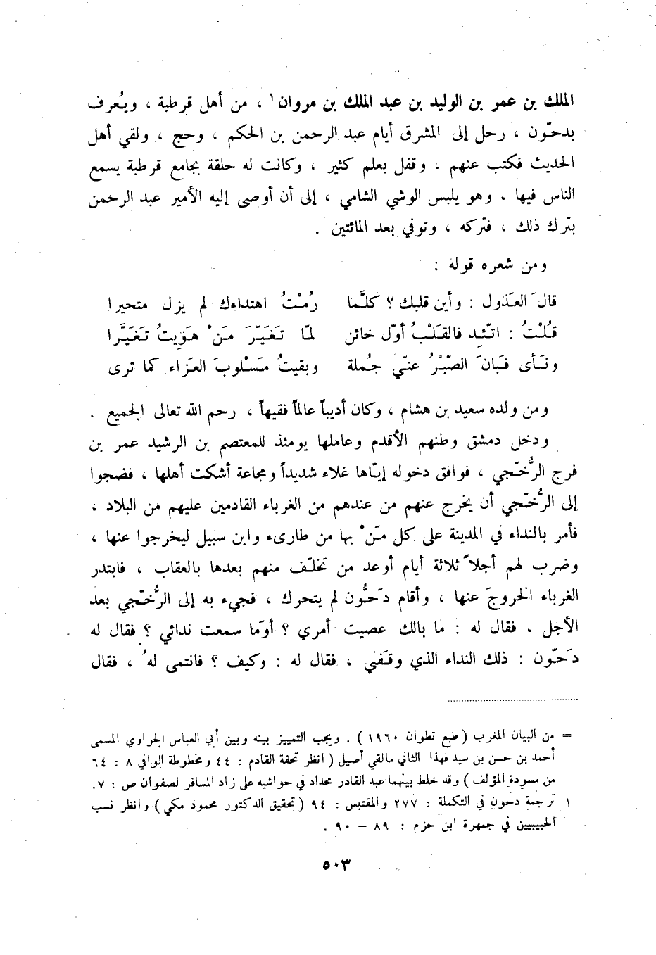 الملك بن عمر بن الوليد بن عبد الملك بن مروان (1) ، من أهل قربة، ويعرف بدحّون، رحل إلى المشرق أيام عبد الرحمن بن الحكم، وحج، ولقي أهل الحديث فكتب عنهم، وقفل بعلم كثير، وكانت له حلقة بجامع قرطبة يسمع الناس فيها، وهو يلبس الوشي الشامي، إلى أن أوصى غليه الأمير عبد الرحمن بترك ذلك، فتركه، وتوفّي بعد المائتين.