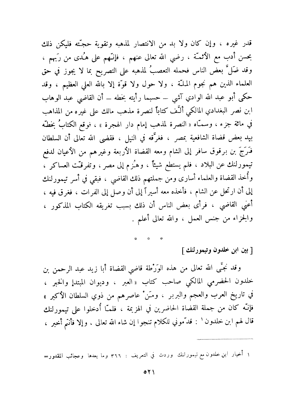 قد رغيره، وإن كان ولا بد من الانتصار مذهبه وتقوية حجّته فليكن ذلك بحسن أدب مع الأئمة، رضي الله تعالى عنهم، فإنّهم على هدى من ربهم، وقد ضلّ بعض الناس فحمله التعصب لمذهبه على التصريح بما لا يجوز في حق العلماء الذين هم نجوم الملّة، ولا حول ولا قوة إلا بالله العلي العظيم، وقد حكى أبو عبد الله الوادي آشي - حسبما رأيته بخطه - أن القاضي عبد الوهاب ابن نصر البغدادي المالكي ألّف كتاباً لنصرة مذهب مالك على غيره من المذاهب في مائة جزء، وسمّاه النصرة لمذهب إمام دار الهجرة، فوقع الكتاب بخطّه بيد بعض قضاة الشافعية بمصر، فغرّقه في النيل، فقضى الله تعالى أن السلطان فرج بن برقوق سافر إلى الشام ومعه القضاة الأربعة وغيرهم من الأعيان لدفع تيمورلنك عن البلاد، فلم يستطع شيئاً، وهزم إلى مصر، وتفرّقت العساكر، وأخذ القضاة والعلماء أسارى ومن جملتهم ذلك القاضي، فبقي في أسرتيمورلنك إلى أن ارتحل عن الشام، فأخذه معه أسيراً إلى أن وصل إلى الفرات، فغرق فيه، أعني القاضي، فرأى بعض الناس أن ذلك بسبب تغريقه الكتاب المذكور، والجزاء من جنس العمل، والله تعالى أعلم.