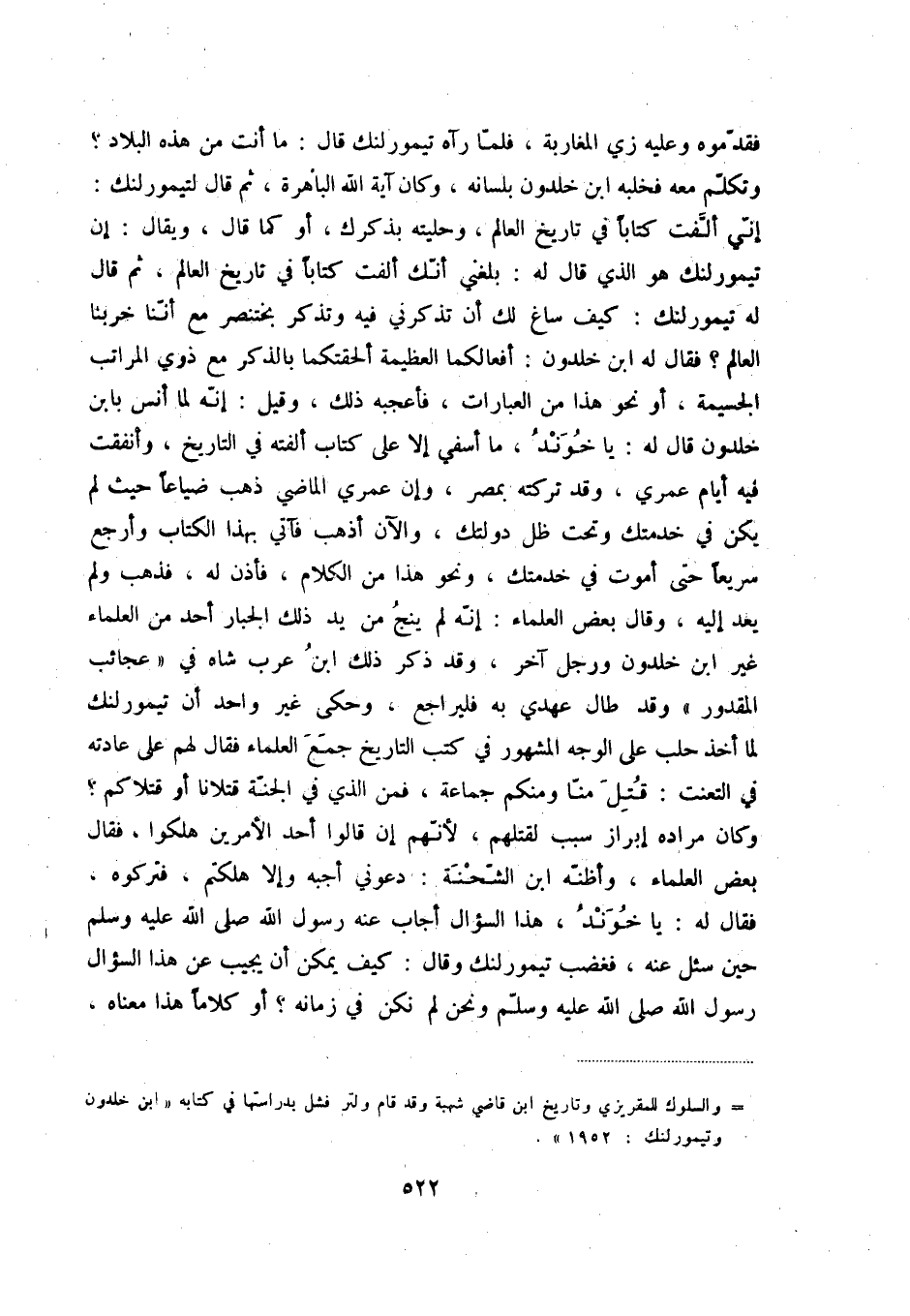 فقدّموه وعليه زي المغاربة، فلمّا رآه تيمورلنك قال: ما أنت من هذه البلاد وتكلّم معه فخلبه ابن خلدون بلسانه، وكان آية الله الباهرة، ثم قال لتيمورلنك: إنّي ألّفت كتاباً في تاريخ العالم، أو كما قال، ويقال: إن تيمورلنك هو الذي قال له: بلغني أنّك ألفت كتاباً في تاريخ العالم، ثم قال له تيمورلنك: كيف ساغ لك أن تذكرني فيه وتذكر بختنصر مع أنّنا خربنا العالم فقال له ابن خلدون: أفعالكما العظيمة ألحقتكما بالذكر مع ذوي المراتب الجسيمة، أو نحو هذا من العبارات، فأعجبه ذلك، وقيل: إنّه لما أنس بابن خلدون قال له: يا خوند، ما أسفي إلا على كتاب ألفته في التاريخ، وأنفقت فيه أيام عمري، وقد تركته بمصر، وإن عمري الماضي ذهب ضياعاً حيث لم يكن في خدمتك وتحت ظل دولتك، والآن أذهب فآتي بهذا الكتاب وأرجع سريعاً حتى أموت في خدمتك، ونحو هذا من الكلام، فأذن له، فذهب ولم يعد إليه، وقال بعض العلماء: إنّه لم ينج من يد ذلك الجبار أحد من العلماء غير ابن خلدون ورجل آخل، وقد ذكر ذلك ابن عرب شاه في عجائب المقدور وقد طال عهدي به فليراجع، وحكى غير واحد أن تيمورلنك لما أخذ حلب على الوجه المشهور في كتب التاريخ جمع العلماء فقال لهم على عادته في التعنت: قبل منّا ومنكم جماعة، فمن الذي في الجنّة قتلانا أو قتلاكم وكان مراده إبراز سبب لقتلهم، لأنّهم إن قالوا أحد الأمرين هلكوا، فقال بعض العلماء، وأظنّه ابن الشّحنة: دعوني أجبه وإلا هلكتم، فتركوه، فقال له: يا خوند، هذا السؤال أجاب عنه رسول الله صلى الله عليه وسلم حين سئل عنه، فغضب تيمورلنك وقال: كيف يمكن أن يجيب عن هذا السؤال رسول الله صلى الله عليه وسلم ونحن لم نكن في زمانه أو كلاماً هذا معناه