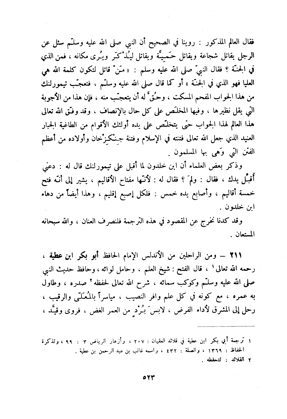 فقال العالم المذكور: روينا في الصحيح أن النبي صلى الله عليه وسلّم سئل عن الرجل يقاتل شجاعة ويقاتل حميّة ويقاتل ليذكر ويرى مكانه، فمن الذي في الجنّة فقال النبيّ صلى الله عليه وسلّم: " من قاتل لتكون كلمة الله هي العليا فهو الذي في الجنّة " أو كما قال صلى الله عليه وسلّم، فتعجّب تيمورلنك من هذا الجواب المفحم المسكت، وحقّ له أن يتعجّب منه، فإن هذا من الأجوبة التي يقل نظيرها، وفيها المخلص على كل حال بالإنصاف، وقد وفّق الله تعالى هذا العالم لهذا الجواب حتى يتخلّص على يده أولئك الأقوام من الطاغية الجبار العنيد الذي جعل تعالى فتنته في الإسلام وفتنة جنكزخان وأولاده من أعظم الفتن التي وهى بها المسلمون.
