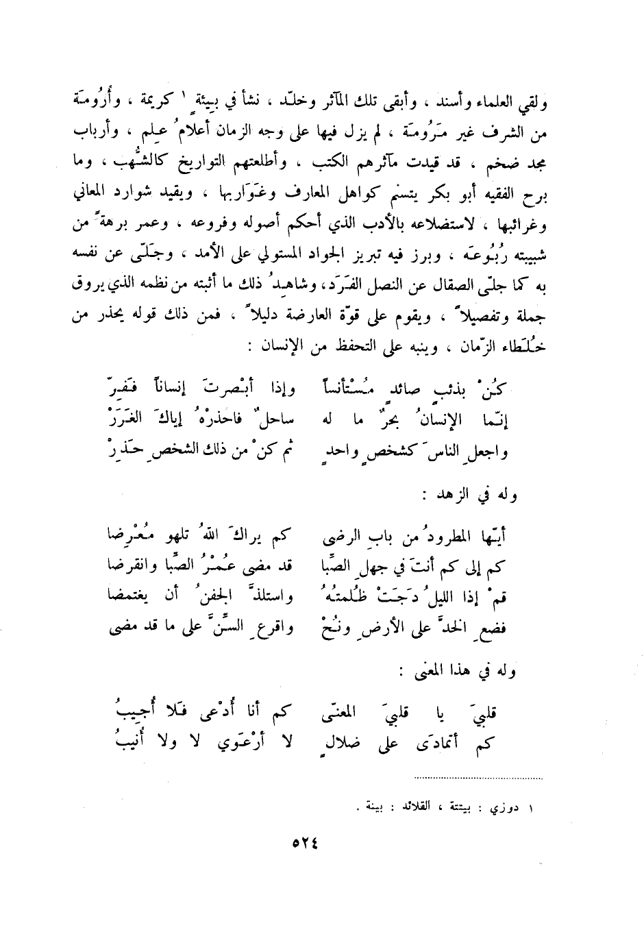ولقي العلماء وأسند، وأبقى تلك المآثر وخلّد، نشأ في بيئةٍ (1) كريمة، وأرومة من الشف غير مرومة، لم يزل فيها على وجه الزمان أعلام علم، وأرباب مجد ضخم، قد قيدت مآثرهم الكتب، وأطلعتهم التواريخ كالشّهب، وما برح الفقيه أبو بكر يتسنم كواهل المعارف وغواربها، ويقيد شوارد المعاني وغرائبها، لاستضلاعه بالأدب الذي أحكم أصوله وفروعه، وعمر برهةً من شبيبته ربوعه، وبرز فيه تبريز لجواد المستولي على الأمد، وجلّى عن نفسه به كما جلّى الصقال عن النصل الفرد، وشاهد ذلك ما أثبته من نظمه الذي يروق جملة وتفصيلاً، ويقوم على قوّة العارضة دليلاً، فمن ذلك قوله يحذر من خلطاء الزّمان، وينبه على التحفظ من الإنسان: