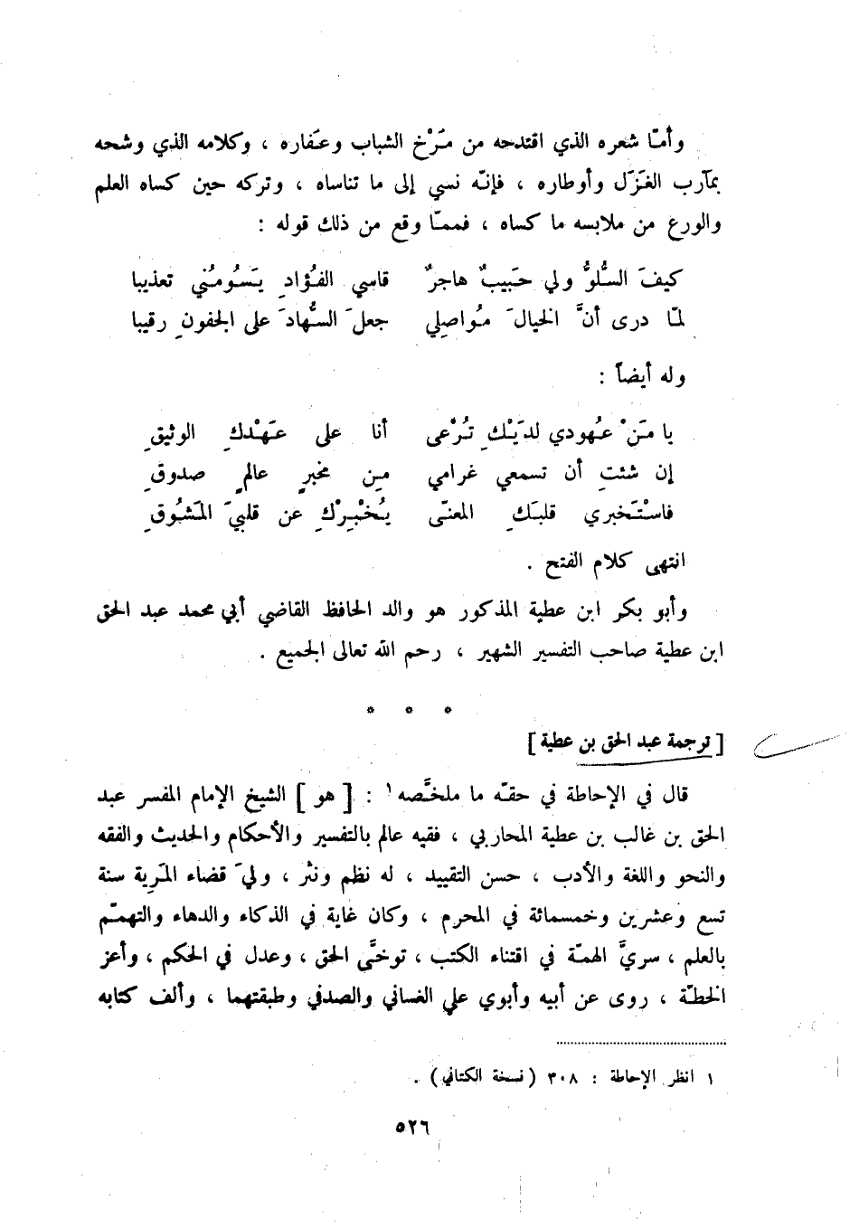 قال في الإحاطة في حقّه ما ملخّصه (1) : [هو] الشيخ الإمام المفسر عبد الحق بن غالب بن عطية المحاربي، فقيه عالم بالتفسير والأحكام والحديث والفقه والنحو واللغة والأدب، حسن التقييد، له نظم ونثر ولي قضاء المرية سنة تسع وعشرين وخمسمائة في المحرم، وكان غاية في الذكاء والدهاء والتهمّم بالعلم، سريّ الهمّة في اقتناء الكتب، توخّى الحق، وعدل في الحكم، وأعز الخطّة، روى عن أبيه وأبوي علي الغساني والصدفي وطبقتهما، وألف كتابه