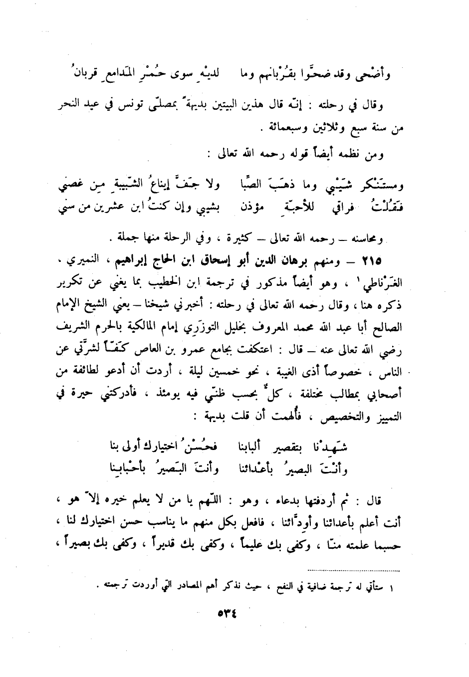 215 - ومنهم برهان الدين أبو إسحاق ابن الحاج إبراهيم، النميري، الغرناطي (1) ، وهو أيضاً مذكور في ترجمة ابن الخطيب بما يغني عن تكرير ذكره هنا، وقال رحمه الله تعالى في رحلته: أخبرني شيخنا - يعني الشيخ الإمام الصالح أبا عبد الله محمد المعروف بخليل التوزري إمام المالكية بالحرم الشريف رضيا له تعالى عنه - قال: اعتكفت بجامع عمرو بن العاص كفّاً لشرّتي عن الناس، خصوصاً أذى الغيبة، نحو خمسين ليلة، أردت أن أدعو لطائفة من أصحابي بمطالب مختلفة، كلٌّ بحسب ظنّي فيه يومئذ، فأدركتني حيرة في التمييز والتخصيص، فألهمت أن قلت بديهة: