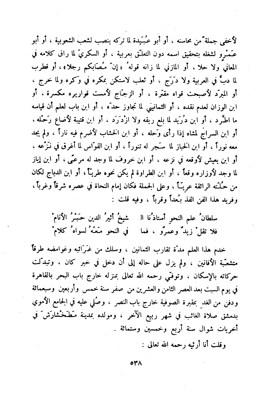 لأخفى جملةً من محاسنه، أو أبو عبيدة لما تركه ينصب لشعب الشعوبية، أو أبو عمروٍ لشغله بتحقق اسمه دون التعلّق بعربية، أو السكّري لما راق كلامه في المعاني ولا حلا، أو المازني لما زانه قوله إنّ مصابكم رجلا، او قطرب لما دبّ في العربية ولا درج، أو ثعلب لاستكن بمكره في وكره ولما خرج، أو المبرّد لأصبحت قواه مقترة، أو الزجّاج لأمست قواريره مكسرة، أو ابن الوزان لعدم نقده، أو الثمانيني لما تجاوز حدّه، أو ابن باب العلم أن قياسه ما اطّرد، أو ابن دريدلما بلع ريقه ولا ازدرد، أو ابن قتيبة لأضاع رحله، أو ابن السراج لمشاه إذا رأى وحله، أو ابن الخشاب لأضرم فيه ناراً، ولم يجد معه نوراً، أو ابن الخباز لما سجر له تنوراً، أو ابن القوّاس لما غرق في نزعه، أو ابن يعيش لأوقعه في نزعه، أو ابن خروف لما وجد له مرعىً، أو ابن إياز لما وجد لأوزاره وقعاً، أو ابن الطراوة لم يكن نحوه طريّاً، أو ابن الدباج لكان من حلّته الرائقة عريّاً، وعلى الجملة فكان إمام النحاة في عصره شرقاً وغرباً، وفريد هذا الفن الفذ بعداً وقرباً، وفيه قلت:
