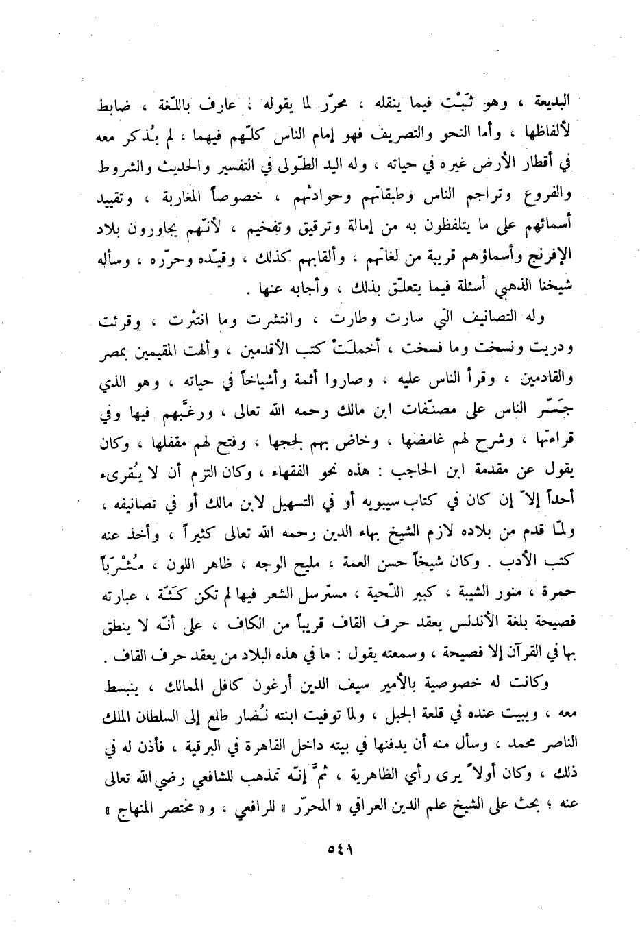 البديعة، وهو ثبت فيما ينقله، محرّر لما يقوله، عارف باللّغة، ضابط لألفاظها، وأما النحو والتصريف فهو إمام الناس كلّهم فيهما، لم يذكر معه في أقطار الأرض غيره في حياته، وله اليد الطّولى في التفسير والحديث والشروط والفروع وتراجم الناس وطبقاتهم وحوادثهم، خصوصاً المغاربة، وتقييد أسمائهم على ما يتلفظون به من إمالة وترقيق وتفخيم، لأنّهم يجاورون بلاد الإفرنج وأسماؤهم قريبة من لغاتهم، وألقابهم كذلك، وقيّده وحرّره، وسأله شيخنا الذهبي أسئلة فيما يتعلّق بذلك، وأجابه عنها.