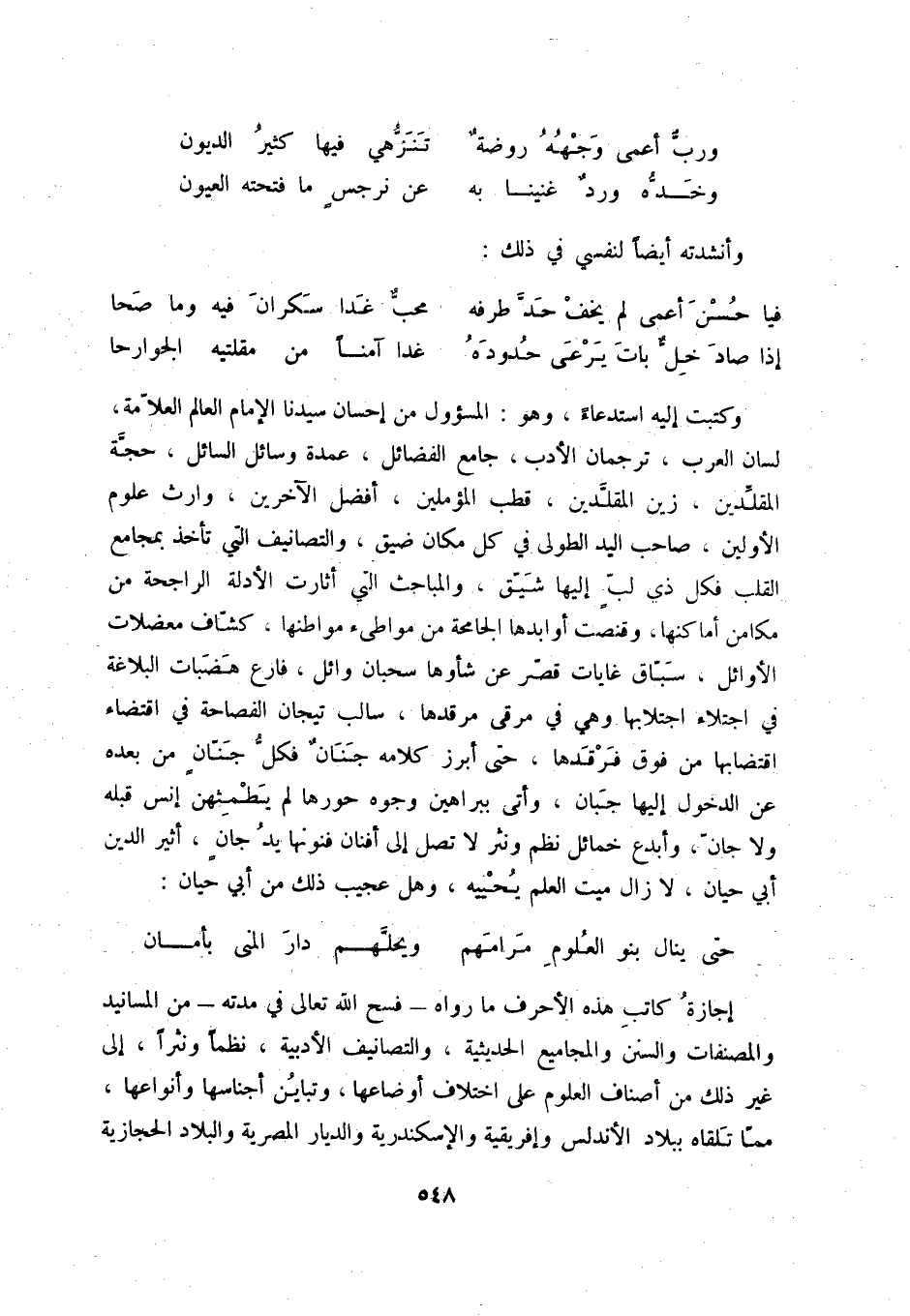 وكتبت إليه استدعاءً، وهو: المسؤول من إحسان سيدنا الإمام العالم العلاّمة، لسان العرب، ترجمان الأدب، جامع الفضائل، عمدة وسائل السائل، حجّة المقلّدين، زين المقلّدين، قطب المؤملين، أفضل الآخرين، وارث علوم الأولين، صاحب اليد الطولى في كل مكان ضيق، والتصانيف التي تأخذ بمجامع القلب فكل ذي لبٍّ إليها شيّق، والمباحث التي أثارت الأدلة الراحجة من مكامن أماكنها، وقنصت أوابده الجامحة من مواطئ مواطنها، كشّاف معضلات الأوائل، سبّاق غايات قصّر عن شأوها سبحان وائل، فارع هضبات البلاغة في اجتلاء اجتلابها وهي في مرقدها، سالب تيجان الفصاحة في اقتضاء اقتضابها من فوق فرقدها، حتى أبرز كلامه جنانٌ فكلّ جنّانٍ من بعده عن الدخول إليها جبان، وأتى ببراهين وجوه حورها لم يطمثهن إنس قبله ولا جان، وأبدع خمائل نظم ونثر لا تصل إلى أفنان فنونها يد جانٍ، أثير الدين أبي حيان، لا زال ميت العلم يحييه، وهل عجيب ذلك من أبي حيان: