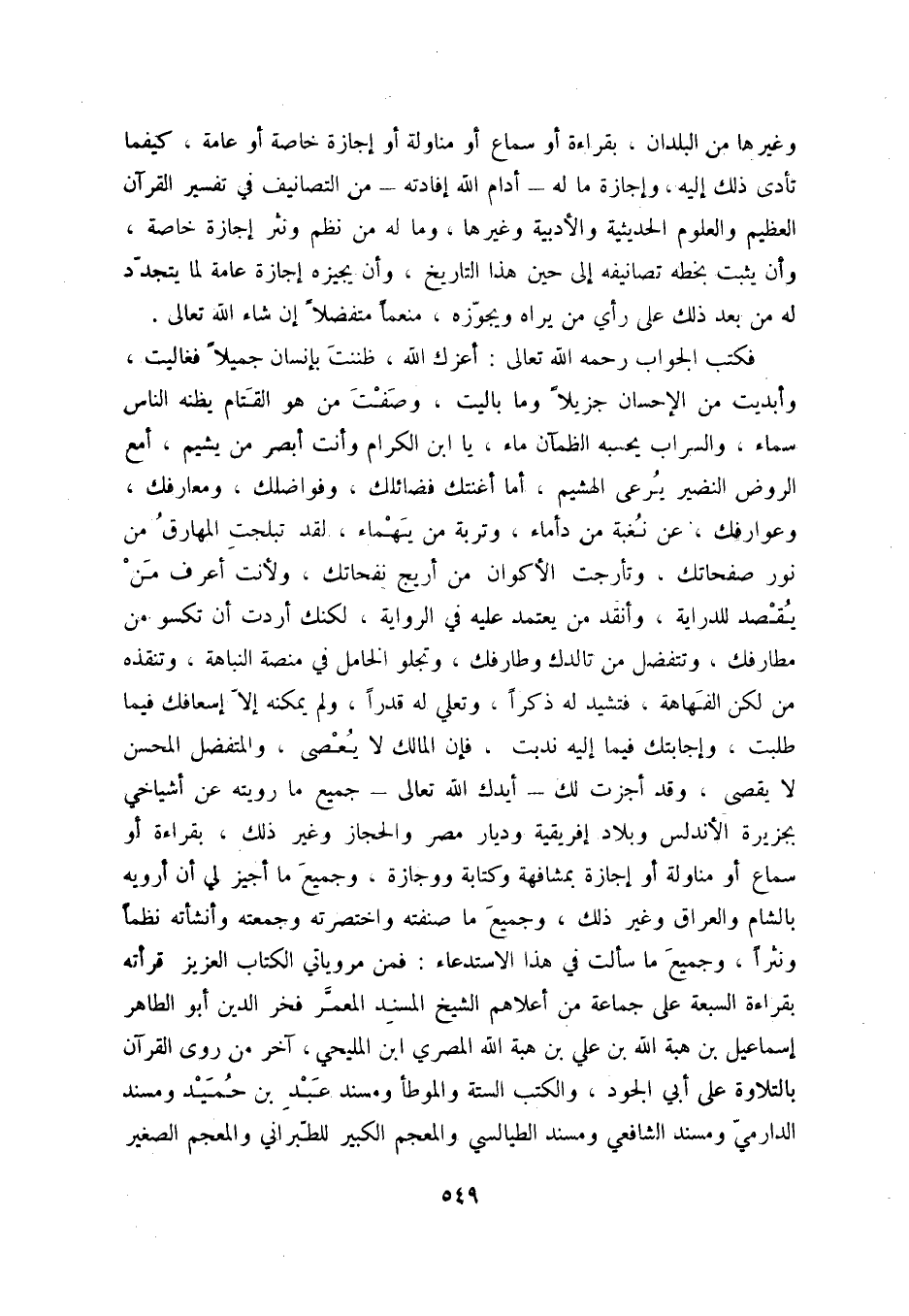 وغيرها من البلدان، بقراءة أو سماع أو مناولة أو إجازة خاصة أو عامة، كيفما تأدى ذلك إليه، وإجازة ما له - أدام الله إفادته - من التصانيف في تفسير القرآن العظيم والعلوم الحديثية والأدبية وغيرها، وما له من نظم ونثرإجازة خاصة، وأن يثبت بخطه تصانيفه إلى حني هذا التاريخ، وأن يجيزه إجازة عامة لما يتجدّد له من بعد ذلك على رأي من يراه ويجوزه، منعماً متفضلاً إن شاء الله تعالى.