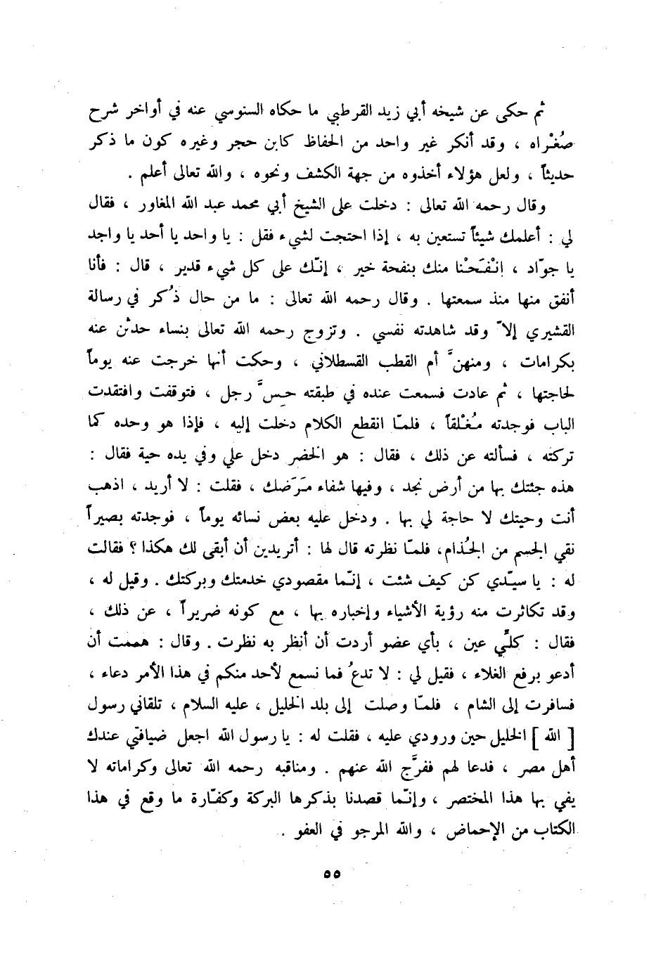 وقال رحمه الله تعالى: دخلت على الشيخ أبي محمد عبد الله المغاور، فقال لي: أعلمك شيئاً تستعين به، إذا احتجت لشيء فقل: يا واحد يا أحد يا واجد يا جوّاد، انفحنا منك بنفحة خير، إنّك على كل شيء قدير، قال: فأنا أنفق منها منذ سمعتها. قال رحمه الله تعالى: ما من حال ذكر في رسالة القشيري إلاّ وقد شاهدته نفسي. وتزوج رحمه الله تعالى بنساء حدثن عنه بكرامات، ومنهنّ أم القطب القسطلاني، وحكت أنها خرجت عنه يوماً لحاجتها، ثم عادت فسمعت عنده في طبقته حسّ رجل، فتوقفت وافتقدت الباب فوجدته مغلقاً، فلمّا انقطع الكلام دخلت إليه، فإذا هو وحده كما تركته، فسألته عن ذلك، فقال: هو الخضر دخل علي وفي يده حية فقال: هذه جئتك بها من أرض نجد، وفيها شفاء مرضك، فقلت: لا أريد، اذهب أنت وحيتك لا حاجة لي بها. ودخل عليه بعض نسائه يوماً، فوجدته بصيراً نقي الجسم من الجذام، فلمّا نظرته قال لها: أتريدين أن أبقى لك هكذا فقال له: يا سيّدي كن كيف شئت، إنّما مقصودي خدمتك وبركتك. وقيل له، وقد تكاثرت منه رؤية الأشياء وإخباره بها، مع كونه ضريراً، عن ذلك، فقال: كلّي عين، بأي عضو أردت أن أنظر به نظرت. وقال: هممت أن أدعو برفع الغلاء، فقيل لي: لا تدع فما نسمع لأحد منكم في هذا الأمر دعاء، فسافرت إلى الشام، فلمّا وصلت إلى بلد الخليل، عليه السلام، تلقاني رسول [الله] الخليل حين ورودي عليه، فقلت له: يا رسول الله اجعل ضيافتي عندك أهل مصر، فدعا لهم ففرّج الله عنهم. ومناقبه رحمه الله تعالى وكراماته لا يفي بها هذا المختصر، وإنّما قصدنا بذكرها البركة وكفّارة ما وقع في هذا الكتاب من الإحماض، والله المرجو في العفو.