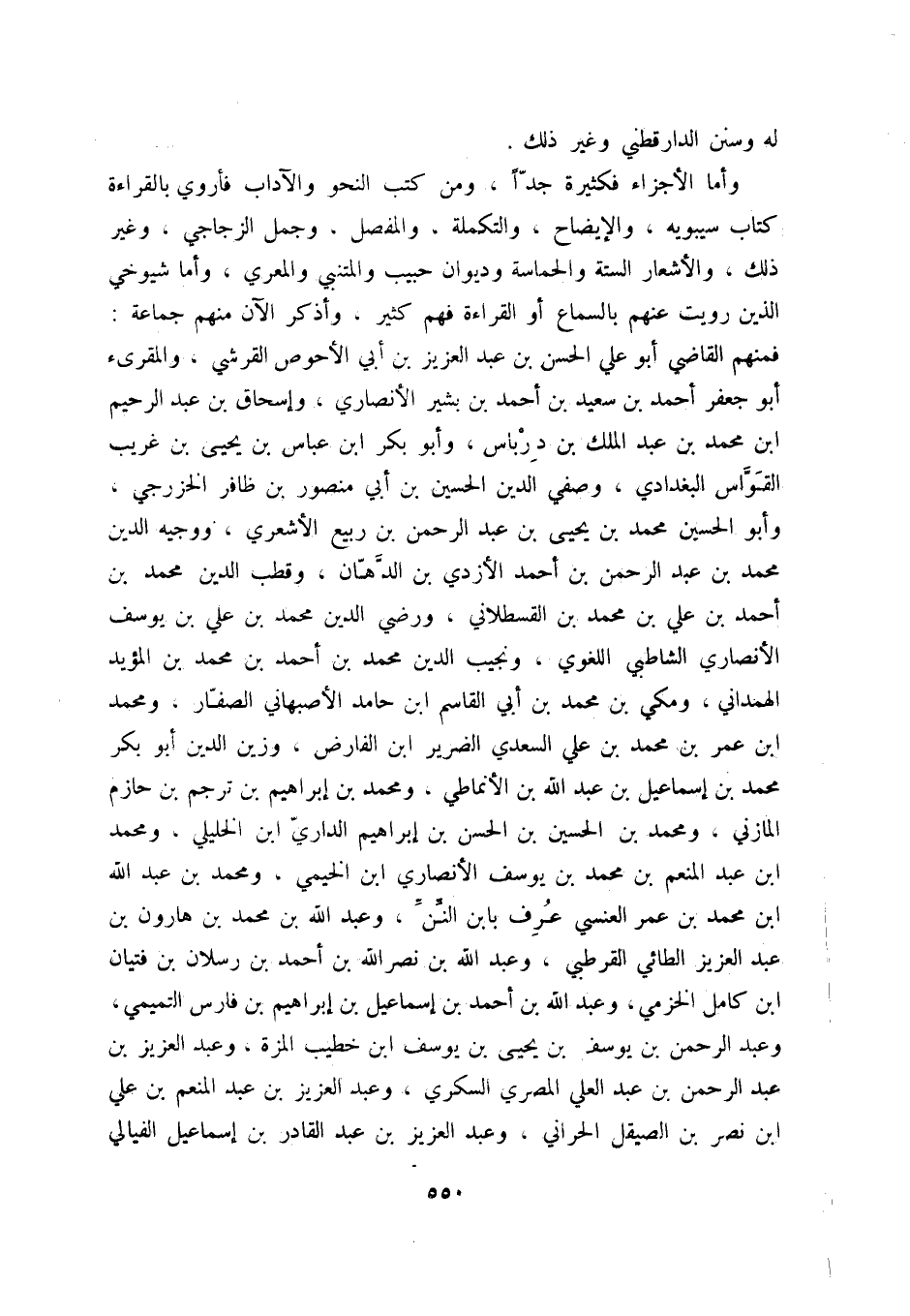وأما الأجزاء فكثيرة جدّاً، ومن كتب النحو والآداب فأروي بالقراءة كتاب سيبويه، والإيضاح، والتكملة، والمفصل، وجمل الزجاجي، وغير ذلك، والأشعار الستة والحماسة وديوان حبيب والمتنبي والمعري، وأما شيوخي الذين رويت عنهم بالسماع أو بالقراءة فهم كثير، وأذكر الآن منهم جماعة: فمنهم القاضي أبو علي الحسن بن عبد العزيز بن أبي الأحوص القرشي، والمقرئ أبو جعفر أحمد بن سعيد بن أحمد بن بشير الأنصاري، وإسحاق بن عبد الرحيم ابن محمد بن عبد الملك بن درباس، وأبو بكر ابن عباس بن يحيى بن غريب القوّاس البغدادي، وصفي الدين الحسين بن أبي منصور بن ظافر الخزرجي، وأبو الحسين محمد بن يحيى بن عبد الرحمن بن ربيع الأشعري، ووجيه الدين محمد بن عبد الرحمن بن أحمد الأزدي بن الدّهّان، وقطب الدين محمد بن أحمد بن علي بن محمد بن القسطلاني، ورضي الدين محمد بن علي بن يوسف الأنصاري الشاطبي اللغوي، ونجيب الدين محمد بن أحمد بن محمد بن المؤيد الهمداني، ومكي بن محمد بن أبي القاسم ابن حامد الأصبهاني الصفّار، ومحمد ابن عمر بن محمد بن علي السعدي الضرير ابن الفارض، وزين الدين أبو بكر محمد بن إسماعيل بن عبد الله بن الأنماطي، ومحمد بن إبراهيم بن ترجم بن حازم المازني، ومحمد بن الحسين بن الحسن بن إبراهيم الداريّ ابن الخليلي، ومحمد ابن محمد بن عمر العنسي عرف بابن النّنّ، وعبد الله بن محمد بن هارون بن عبد العزيز الطائي القرطبي، وعبد الله بن نصر الله بن أحمد بن رسلان بن فتيان ابن كامل الخزمي، وعبد الله بن أحمد بن إسماعيل بن إبراهيم بن فارس التميمي، وعبد الرحمن بن يوسف بن يحيى بن يوسف ابن خطيب المزة، وعبد العزيز بن عبد الرحمن بن عبد العلي المصري السكري، وعبد العزيز بن عبد المنعم بن علي ابن نصر بن الصيقل الحراني، وعبد العزيز بن عبد القادر بن إسماعيل الفيالي