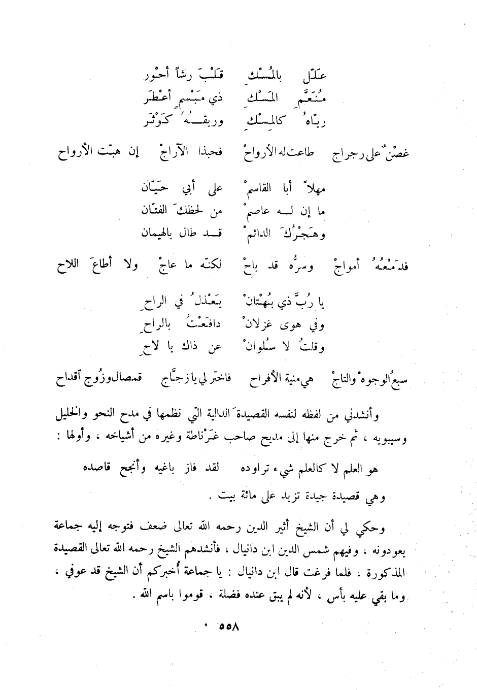 وحكي لي أن الشيخ أثير الدين رحمه الله تعالى ضعف فتوجه إليه جماعة يعودونه، وفيهم شمس الدين ابن دانيال، فأنشدهم الشيخ رحمه الله تعالى القصيدة المذكورة، فلما فرغت قال ابن دانيال: يا جماعة أخبركم أن الشيخ قد عوفي، وما بقي عليه بأس، لأنه لم يبق عنده فضلة، قوموا باسم الله.