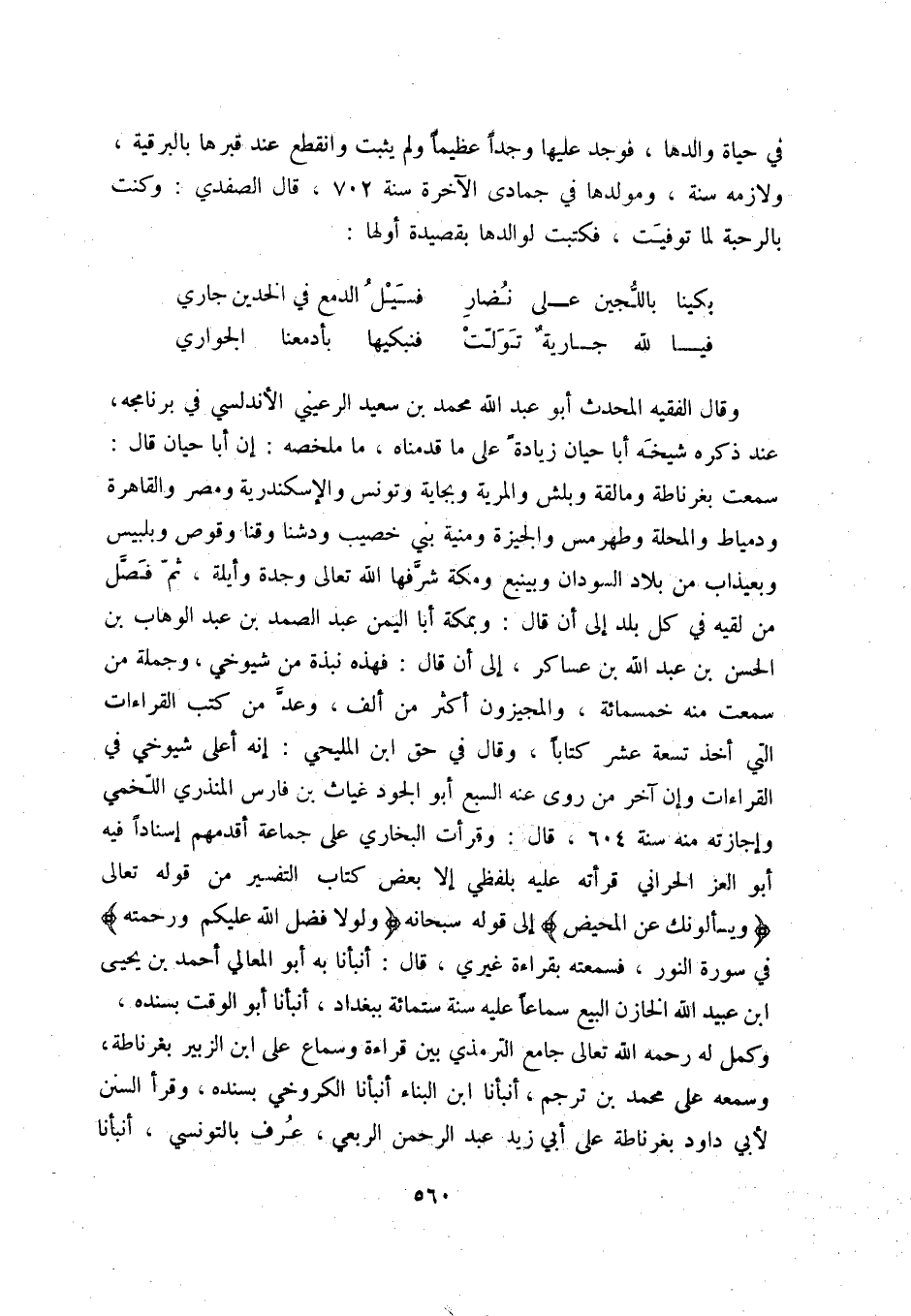 في حياة والدها، فوجد عليها وجداً عظيماً ولم يثبت وانقطع عند قبرها بالبرقية، ولازمه سنة، ومولدها في جمادى الآخرة سنة702، قال الصفدي: وكنت بالرحبة لما توفيت، فكتبت لوالدها بقصيدة أولها: