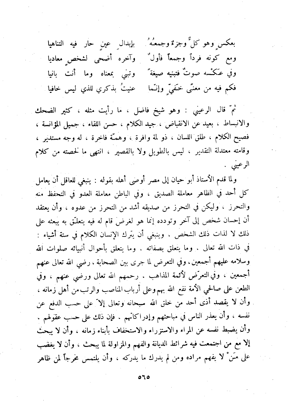ولما قدم الأستاذ أبو حيان إلى مصر أوصى أهله بقوله: ينبغي للعاقل أن يعامل كل أحد في الظاهر معاملة الصديق، وفي الباطن معاملة العدو في التحفظ منه والتحرز، وليكن في التحرز من صديقه أشد من التحرز من عدوه، وأن يعتقد أن إحسان شخص إلى آخر وتودده إنما هو لغرض قام له فيه يتعلّق به يبعثه على ذلك لا لذات الشخص، وينبغي أن يترك الإنسان الكلام في ستة أشياء: في ذات الله تعالى، وما يتعلق بصفاته، وما يتعلق بأحوال أنبيائه صلوات الله وسلامه عليهم أجمعين، وفي التعرض لما جرى بين الصحابة رضي الله تعالى عنهم أجمعين، وفي التعرّض لما جرى بين الصحابة، رضي الله تعالى عنهم أجمعين، وفي التعرّض لأئمة المذاهب، رحمهم الله تعالى ورضي عنهم، وفي الطعن على صالحي الأمة نفع الله بهم وعلى أرباب المناصب والرتب من أهل زمانه، وأن لا يقصد أذى أحد من خلق الله سبحانه وتعالى إلاّ على حسب الدفع عن نفسه، وأن يعذر الناس في مباحثهم وإدراكاتهم، فإن ذلك على حسب عقولهم، وأن يضبط نفسه عن المراء والاستزراء والاستخفاف بأبناء زمانه، وأن لا يبحث إلا مع من اجتمعت فيه شرائط الديانة والفهم والمزاولة لما يبحث، وأن لا يغضب على من لا يفهم مراده ومن لم يدرك ما يدركه، وأن يلتمس مخرجاً لمن ظاهر