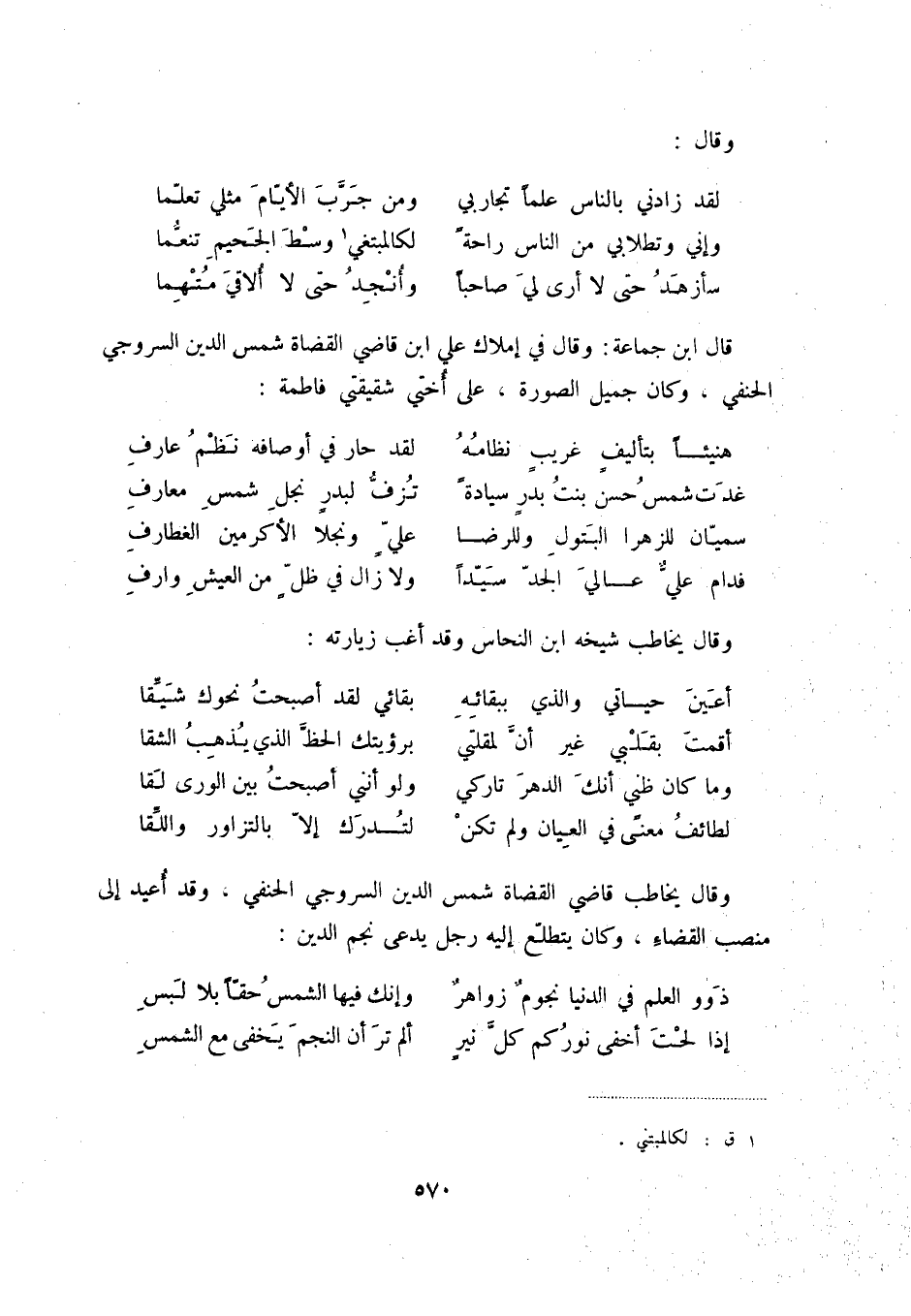 قال ابن جماعة: وقال في إملاك علي ابن قاضي القضاة شمس الدين السروجي الحنفي، وكان جميل الصورة، على أختي شقيقتي فاطمة: