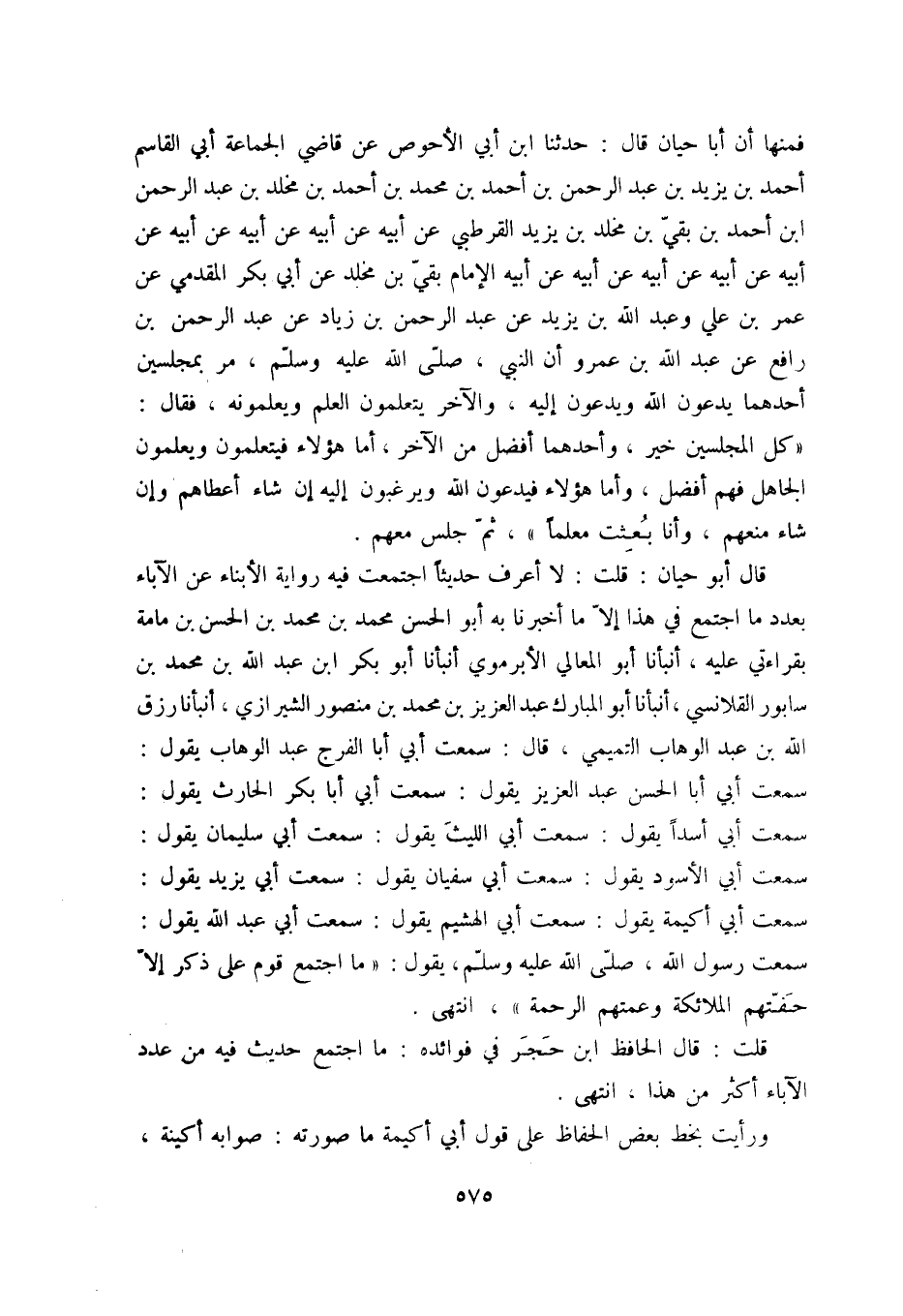 فمنها أن أبا حيان قال: حدثنا ابن أبي الأحوص عن قاضي الجماعة أبي القاسم أحمد بن يزيد بن عبد الرحمن بن أحمد بن محمد بن أحمد بن مخلد بن عبد الرحمن ابن أحمد بن بقّي بن مخلد بن يزيد القرطبي عن أبيه عن أبيه عن أبيه عن أبيه عن أبيه عن أبيه عن أبيه عن أبيه عن أبيه الإمام بقّي بن مخلد عن ابي بكر المقدمي عن عمر بن علي وعبد الله بن يزيد عن عبد الرحمن بن زياد عن عبد الرحمن بن رافع عن عبد الله بن عمرو أن النبي، صلّى الله عليه وسلّم، مر بمجلسين أحدهما يدعون الله ويدعون إليه، والآخر يتعلمون العلم ويعلمونه، فقال: " كل المجلسين خير، وأحدهما أفضل من الآخر، أما هؤلاء فيتعلمون ويعلمون الجاهل فهم أفضل، وأما هؤلاء فيدعون الله ويرغبون إليه إن شاء أعطاهم وإن شاء منعهم، وأنا بعثت معلماً "، ثم جلس معهم.
