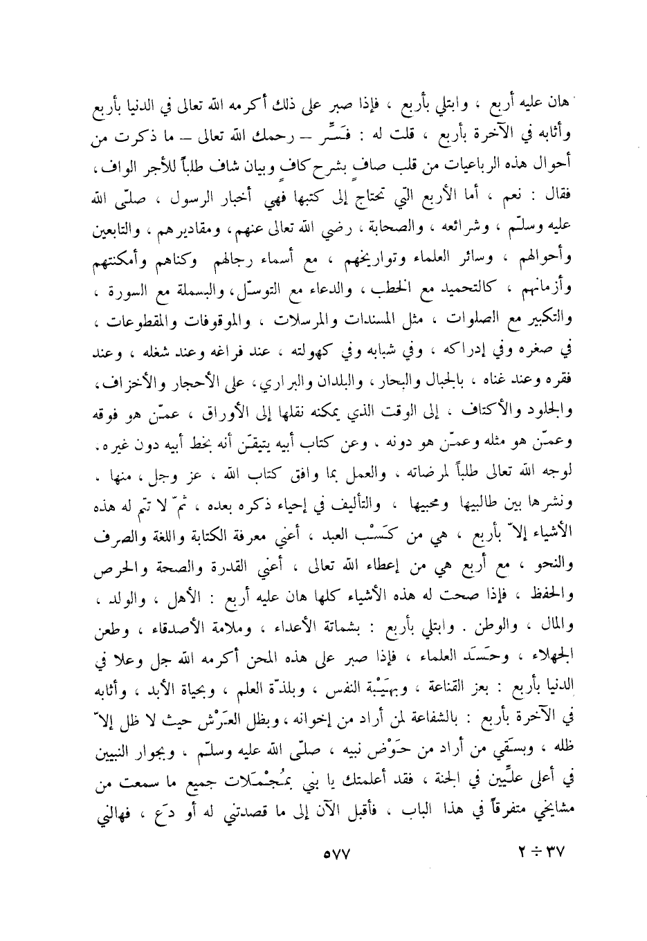 هان عليه أربع، وابتلي بأربع، فإذا صبر على ذلك أكرمه الله تعالى في الدنيا بأربع وأثابه في الآخرة بأربع، قلت له: فسّر - رحمك الله تعالى - ما ذكرت من أحوال هذه الرباعيات من قلب صافٍ بشرحٍ كافٍ وبيان شاف طلباً للأجر الواف، فقال: نعم، أما الأربع التي تحتاج إلى كتبها فهي أخبار الرسول، صلّى الله عليه وسلّم، وشرائعه، والصحابة، رضي الله تعالى عنهم، ومقاديرهم، والتابعين وأحوالهم، وسائر العلماء وتواريخهم، مع أسماء رجالهم وكناهم وأمكنتهم وأزمانهم، كالتحميد مع الخطب، والدعاء مع التوسّل، والبسملة مع السورة، والتكبير مع الصلوات، مثل المسندات والمرسلات، والموقوفات والمقطوعات، وفي صغره وفي إدراكه، وفي شبابه وفي كهولته، عند فراغه وعند شغله، وعند فقره وعند غناه، بالجبال والبحار، والبلدان والبراري، على الأحجار والأخزاف، والجلود والأكتاف، إلى الوقت الذي يمكنه نقلها إلى الأوراق، عمّن هو فوقه وعمّن هو مثله وعمّن هو دونه، وعن كتاب أبيه يتيقّن أنه بخط أبيه دون غيره، لوجه الله تعالى طلباً لمرضاته، والعمل بما وافق كتاب الله، عز وجل، منها، ونشرها بين طالبيها ومحبيها، والتأليف في إحياء ذكره بعده، ثمّ لا تتم له هذه الأشياء إلاّ بأربع، هي من كسب العبد، أعني معرفة الكتابة واللغة والصرف والنحو، مع أربع هي من إعطاء الله تعالى، أعني القدرة والصحة والحرص والحفظ، فإذا صحت له هذه الأشياء كلّها هان عليه أربع: الأهل، والولد، والمال، والوطن، وابتلي بأربع: بشماتة الأعداء، وملامة الأصدقاء، وطعن الجهلاء، وحسد العلماء، فإذا صبر على هذه المحن أكرمه الله جل وعلا في الدنيا بأربع: بعز القناعة، وبهيبة النفس، وبلذّة العلم، وبحياة الأبد، وأثابه في الآخرة بأربع: الشفاعة لمن أراد من إخوانه، وبظل العرش حيث لا ظل إلاّ ظله، وبسقي من أراد من حوض نبيه، صلّى الله عليه وسلّم، بجوار النبيين في أعلى علّيين في الجنة، فقد أعلمتك يا بني بمجملات جميع ما سمعت من مشايخي متفرقاً في هذا الباب، فأقبل الآن إلى ما قصدتني له أو دع، فهالني