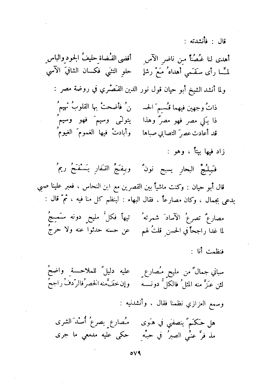 ولما أنشد الشيخ أبو حيان قول نور الدين القصري في روضة مصر: