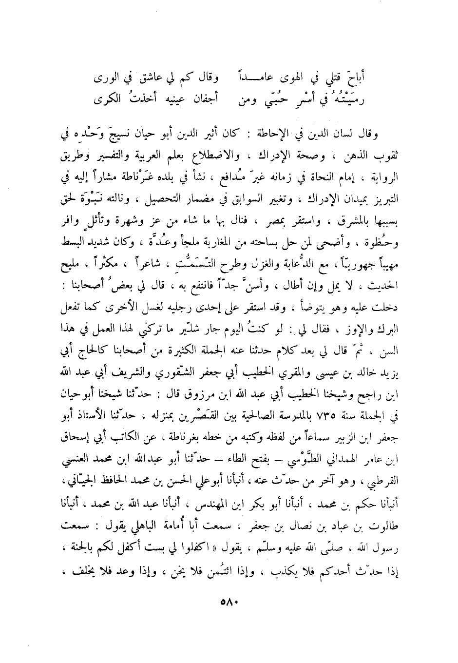 وقال لسان الدين في الإحاطة: كان أثير الدين أبو حيان نسيج وحده في ثقوب الذهن، وصحة الإدراك، والاضطلاع بعلم العربية والتفسير وطريق الرواية، إمام النحاة في زمانه غير مدافع، نشأ في بلده غرناطة مشاراً إليه في التبريز بميدان الإدراك، وتغبير السوابق في مضمار التحصيل، ونالته نبوة لحق بسببها بالمشرق، واستقر بمصر، فنال بها ما شاء من عز وشهرة وتأثلٍ وافر وحظوة، وأضحى لمن حل بساحته من المغاربة ملجأ وعدّة، وكان شديد البسط مهيباً جهوريّاً، مع الدّعابة والغزل وطرح اتّسمّت، شاعراً، مكثراً، مليح الحديث، لا يمل وإن أطال، وأسنّ جدّاً فانتفع به، قال لي بعض أصحابنا: دخلت عليه وهو يتوضأ، وقد استقر على إحدى رجليه لغسل الأخرى كما تفعل البرك والإوز، فقال لي: لو كنت اليوم جار شلّير ما تركني لهذا العمل في هذا السن، ثمّ قال لي بعد كلام حدثنا عنه الجملة الكثيرة من أصحابنا كالحاج أبي يزيد خالد بن عيسى والمقري الخطيب أبي جعفر الشّقوري والشريف أبي عبد الله ابن راجح وشيخنا الخطيب أبي عبد الله ابن مرزوق قال: حدّثنا شيخنا أبو حيان في الجملة سنة 735 بالمدرسة الصالحية بين القصرين بمنزله، حدّثنا الأستاذ أبو جعفر ابن الزبير سماعاً من لفظه وكتبه من خطه بغرناطة، عن الكاتب أبي إسحاق ابن عامر الهمداني الطّوسي - بفتح الطاء - حدّثنا أبو عبد الله ابن محمد العنسي القرطبي، وهو آخر من حدّث عنه، أنبأنا عبد الله محمد الحافظ الجيّاني، أنبأنا حكم بن محمد، أنبأنا أبو بكر ابن المهندس، أنبأنا عبد الله بن محمد، أنبأنا طالوت بن عباد بن نصال بن جعفر، سمعت أبا أمامة الباهلي يقول: سمعت رسول الله، صلّى الله عليه وسلّم، يقول " اكفلوا لي بست أكفل لكم بالجنة، إذا حدّث أحدكم فر يكذب، وإذا ائتمن فلا يخن، وإذا وعد فلا يخلف