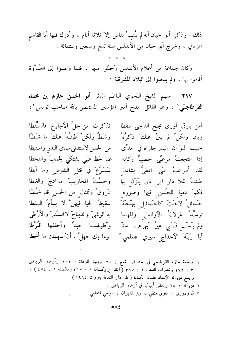 (1) ترجمة حازم القرطاجني في اختصار القدح: 20 وبغية الوعاة: 214 وأزهار الرياض 3: 172 وشذرات الذهب 5: 387 (انظر بروكلمان 1: 317 وتكملته 1: 474) ، وجميع ديوانه الأستاذ عثمان الكعاك (ط. دار الثقافة بيروت 1964) .