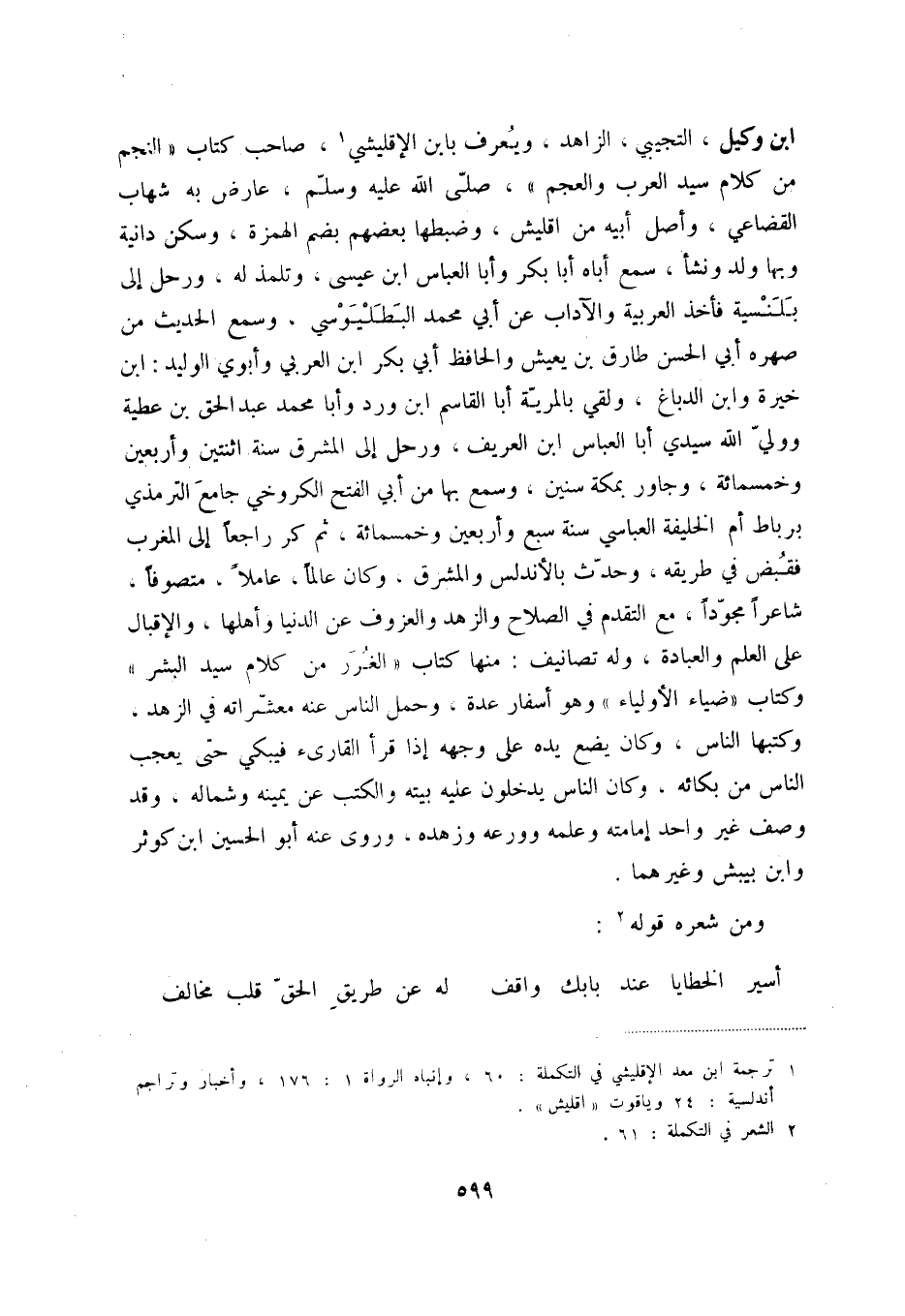 ابن وكيل، التّجيبي، الزاهد ويعرف بابن الإقليشي (1) ، صاحب كتاب النجم من كلام سيد العرب والعجم، صلّى الله عليه وسلّم، عارض به شهاب القضاعي، وأصل أبيه من اقليش، وضبطها بعضهم بضم الهمزة، وسكن دانية وبها ولد ونشأ، سمع أباه أبا بكر وأبا العباس ابن عيسى، وتلمذ له، ورحل إلى بلنسية فأخذ العربية والآداب، عن أبي محمد البطليوسي، وسمع الحديث من صهره أبي الحسن طارق بن يعيش والحافظ أبي بكر ابن العربي وأبوي الوليد: ابن خيرة وابن الدباغ، ولقي بالمريّة أبا القاسم ابن ورد وأبا محمد عبد الحق بن عطية ووليّ الله سيدي أبا العباس ابن العريف، ورحل إلى المشرق سنة اثنتين وأربعين خمسمائة، وجاور بمكة سنين، وسمع بها من أبي الفتح الكروخي جامع الترمذي برباط أم خليفة العباسي سنة سبع وأربعين وخمسمائة، ثم كر راجعاً إلى المغرب فقبض في طريقه، وحدّث بالأندلس والمشرق، وكان عالماً، عاملاً، متصوفاً، شاعراً مجوّداً، مع التقدم في الصلاح والزهد والعزوف عن الدنيا وأهلها، والإقبال على العلم والعبادة، وله تصانيف: منها كتاب الغرر من كلام سيد البشر وكتاب ضياء الأولياء وهو أسفار عدة، وحمل الناس عنه معشّراته في الزهد، وكتبها الناس، وكان يضع يده على وجهه إذا قرأ القارئ فيبكي حتى يعجب الناس من بكائه، وكان الناس يدخلون عليه بيته والكتب عن يمينه وشماله، وقد وصف غير واحد إمامته وعلمه وورعه وزهده، وروى عنه أبو الحسين ابن كوثر وابن بيبش وغيرهما.